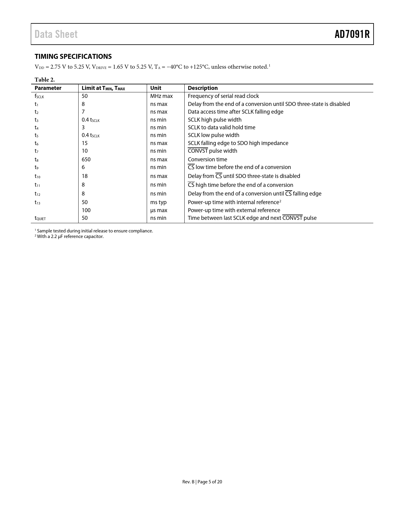 Data SheetAD7091RTIMING SPECIFICATIONS VDD = 2.75 V to 5.25 V, VDRIVE = 1.65 V to 5.25 V, TA = −40°C to +125°C, unless otherwise noted.1 Table 2. ParameterLimit at TMIN, TMAXUnitDescription fSCLK 50 MHz max Frequency of serial read clock t1 8 ns max Delay from the end of a conversion until SDO three-state is disabled t2 7 ns max Data access time after SCLK falling edge t3 0.4 tSCLK ns min SCLK high pulse width t4 3 ns min SCLK to data valid hold time t5 0.4 tSCLK ns min SCLK low pulse width t6 15 ns max SCLK falling edge to SDO high impedance t7 10 ns min CONVST pulse width t8 650 ns max Conversion time t9 6 ns min CS low time before the end of a conversion t10 18 ns max Delay from CS until SDO three-state is disabled t11 8 ns min CS high time before the end of a conversion t12 8 ns min Delay from the end of a conversion until CS falling edge t13 50 ms typ Power-up time with internal reference2 100 µs max Power-up time with external reference tQUIET 50 ns min Time between last SCLK edge and next CONVST pulse 1 Sample tested during initial release to ensure compliance. 2 With a 2.2 µF reference capacitor. Rev. B | Page 5 of 20 Document Outline FEATURES APPLICATIONS GENERAL DESCRIPTION FUNCTIONAL BLOCK DIAGRAM PRODUCT HIGHLIGHTS REVISION HISTORY SPECIFICATIONS TIMING SPECIFICATIONS ABSOLUTE MAXIMUM RATINGS THERMAL RESISTANCE ESD CAUTION PIN CONFIGURATION AND FUNCTION DESCRIPTIONS TYPICAL PERFORMANCE CHARACTERISTICS TERMINOLOGY THEORY OF OPERATION CIRCUIT INFORMATION CONVERTER OPERATION ADC TRANSFER FUNCTION INTERNAL/EXTERNAL VOLTAGE REFERENCE TYPICAL CONNECTION DIAGRAM ANALOG INPUT MODES OF OPERATION Normal Mode Power-Down Mode POWER CONSUMPTION Normal Mode Normal and Power-Down Mode Combination SERIAL INTERFACE WITH BUSY INDICATOR WITHOUT BUSY INDICATOR SOFTWARE RESET INTERFACING WITH 8-/16-BIT SPI OUTLINE DIMENSIONS ORDERING GUIDE