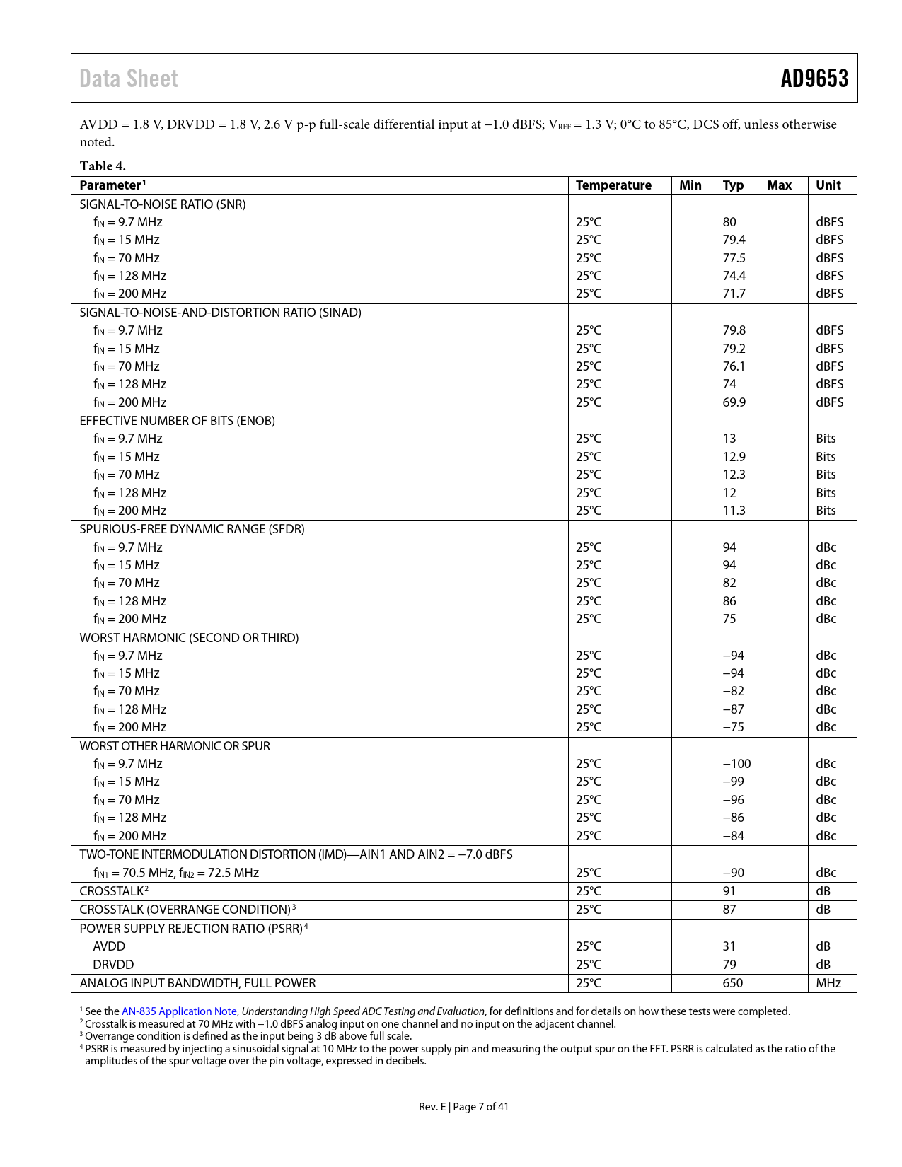Data Sheet. AD9653. Table 4. Parameter1. Temperature. Min. Typ. Max. Unit