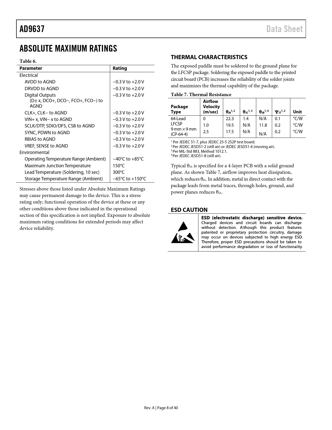 link to page 9 link to page 9 link to page 9 link to page 9 link to page 9 AD9637Data SheetABSOLUTE MAXIMUM RATINGSTHERMAL CHARACTERISTICSTable 6. ParameterRating The exposed paddle must be soldered to the ground plane for Electrical the LFCSP package. Soldering the exposed paddle to the printed AVDD to AGND −0.3 V to +2.0 V circuit board (PCB) increases the reliability of the solder joints DRVDD to AGND −0.3 V to +2.0 V and maximizes the thermal capability of the package. Digital Outputs −0.3 V to +2.0 V Table 7. Thermal Resistance (D± x, DCO+, DCO−, FCO+, FCO−) to Airflow AGND PackageVelocity CLK+, CLK− to AGND −0.3 V to +2.0 V Type(m/sec)θ 1, 21, 31, 41, 2JAθJCθJB Ψ JTUnit VIN+ x, VIN− x to AGND −0.3 V to +2.0 V 64-Lead 0 22.3 1.4 N/A 0.1 °C/W SCLK/DTP, SDIO/DFS, CSB to AGND −0.3 V to +2.0 V LFCSP 1.0 19.5 N/A 11.8 0.2 °C/W 9 mm × 9 mm SYNC, PDWN to AGND −0.3 V to +2.0 V (CP-64-4) 2.5 17.5 N/A N/A 0.2 °C/W RBIAS to AGND −0.3 V to +2.0 V 1 Per JEDEC 51-7, plus JEDEC 25-5 2S2P test board. VREF, SENSE to AGND −0.3 V to +2.0 V 2 Per JEDEC JESD51-2 (stil air) or JEDEC JESD51-6 (moving air). Environmental 3 Per MIL-Std 883, Method 1012.1. 4 Per JEDEC JESD51-8 (still air). Operating Temperature Range (Ambient) −40°C to +85°C Maximum Junction Temperature 150°C Typical θJA is specified for a 4-layer PCB with a solid ground Lead Temperature (Soldering, 10 sec) 300°C plane. As shown Table 7, airflow improves heat dissipation, Storage Temperature Range (Ambient) −65°C to +150°C which reduces θJA. In addition, metal in direct contact with the package leads from metal traces, through holes, ground, and Stresses above those listed under Absolute Maximum Ratings power planes reduces θ may cause permanent damage to the device. This is a stress JA. rating only; functional operation of the device at these or any other conditions above those indicated in the operational ESD CAUTION section of this specification is not implied. Exposure to absolute maximum rating conditions for extended periods may affect device reliability. Rev. A | Page 8 of 40 Document Outline Features Applications General Description Functional Block Diagram Product Highlights Revision History Specifications DC Specifications AC Specifications Digital Specifications Switching Specifications Timing Specifications Timing Diagrams Absolute Maximum Ratings Thermal Characteristics ESD Caution Pin Configuration and Function Descriptions Typical Performance Characteristics AD9637-80 AD9637-40 Equivalent Circuits Theory of Operation Analog Input Considerations Input Common Mode Differential Input Configurations Voltage Reference Internal Reference Connection External Reference Operation Clock Input Considerations Clock Input Options Input Clock Divider Clock Duty Cycle Jitter Considerations Power Dissipation and Power-Down Mode Digital Outputs and Timing SDIO/DFS Pin SCLK/DTP Pin CSB Pin RBIAS Pin Built-In Output Test Modes Output Test Modes Serial Port Interface (SPI) Configuration Using the SPI Hardware Interface Configuration Without the SPI SPI Accessible Features Memory Map Reading the Memory Map Register Table Open Locations Default Values Logic Levels Channel-Specific Registers Memory Map Register Table Memory Map Register Descriptions Device Index (Register 0x04 and Register 0x05) Transfer (Register 0xFF) Power Modes (Register 0x08) Bits[7:6]—Open Bits[1:0]—Internal Power-Down Mode Enhancement Control (Register 0x0C) Bits[7:3]—Open Bit 2—Chop Mode Bits[1:0]—Open Output Mode (Register 0x14) Bit 7—Open Bit 6—LVDS-ANSI/LVDS-IEEE Option Bits[5:3]—Open Bit 2—Output Invert Bit 1—Open Bit 0—Output Format Output Adjust (Register 0x15) Bits[7:6]—Open Bits[5:4]—Output Driver Termination Bits[3:1]—Open Bit 0—Output Drive Output Phase (Register 0x16) Bit 7—Open Bits[6:4]—Input Clock Phase Adjust Bits[3:0]—Output Clock Phase Adjust Resolution/Sample Rate Override (Register 0x100) User I/O Control 2 (Register 0x101) Bits[7:1]—Open Bit 0—SDIO Pull-Down User I/O Control 3 (Register 0x102) Bits[7:4]—Open Bit 3—VCM Power-Down Bits[2:0]—Open Applications Information Design Guidelines Power and Ground Recommendations Clock Stability Considerations Exposed Pad Thermal Heat Slug Recommendations VCM Reference Decoupling SPI Port Outline Dimensions Ordering Guide