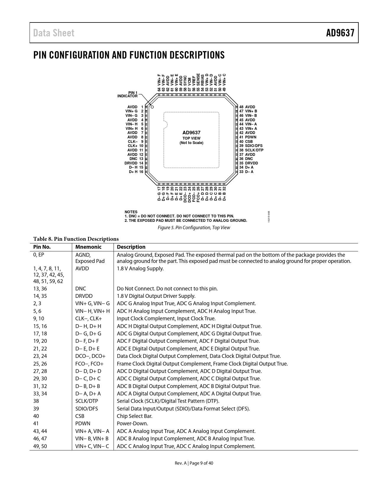 0, EP AGND, Analog Ground, Exposed Pad. The exposed thermal pad on the bottom of the package provides the Exposed Pad analog ground for the part. This exposed pad must be connected to analog ground for proper operation. 1, 4, 7, 8, 11, AVDD 1.8 V Analog Supply. 12, 37, 42, 45, 48, 51, 59, 62 13, 36 DNC Do Not Connect. Do not connect to this pin. 14, 35 DRVDD 1.8 V Digital Output Driver Supply. 2, 3 VIN+ G, VIN− G ADC G Analog Input True, ADC G Analog Input Complement. 5, 6 VIN− H, VIN+ H ADC H Analog Input Complement, ADC H Analog Input True. 9, 10 CLK−, CLK+ Input Clock Complement, Input Clock True. 15, 16 D− H, D+ H ADC H Digital Output Complement, ADC H Digital Output True. 17, 18 D− G, D+ G ADC G Digital Output Complement, ADC G Digital Output True. 19, 20 D− F, D+ F ADC F Digital Output Complement, ADC F Digital Output True. 21, 22 D− E, D+ E ADC E Digital Output Complement, ADC E Digital Output True. 23, 24 DCO−, DCO+ Data Clock Digital Output Complement, Data Clock Digital Output True. 25, 26 FCO−, FCO+ Frame Clock Digital Output Complement, Frame Clock Digital Output True. 27, 28 D− D, D+ D ADC D Digital Output Complement, ADC D Digital Output True. 29, 30 D− C, D+ C ADC C Digital Output Complement, ADC C Digital Output True. 31, 32 D− B, D+ B ADC B Digital Output Complement, ADC B Digital Output True. 33, 34 D− A, D+ A ADC A Digital Output Complement, ADC A Digital Output True. 38 SCLK/DTP Serial Clock (SCLK)/Digital Test Pattern (DTP). 39 SDIO/DFS Serial Data Input/Output (SDIO)/Data Format Select (DFS). 40 CSB Chip Select Bar. 41 PDWN Power-Down. 43, 44 VIN+ A, VIN− A ADC A Analog Input True, ADC A Analog Input Complement. 46, 47 VIN− B, VIN+ B ADC B Analog Input Complement, ADC B Analog Input True. 49, 50 VIN+ C, VIN− C ADC C Analog Input True, ADC C Analog Input Complement. Rev. A | Page 9 of 40 Document Outline Features Applications General Description Functional Block Diagram Product Highlights Revision History Specifications DC Specifications AC Specifications Digital Specifications Switching Specifications Timing Specifications Timing Diagrams Absolute Maximum Ratings Thermal Characteristics ESD Caution Pin Configuration and Function Descriptions Typical Performance Characteristics AD9637-80 AD9637-40 Equivalent Circuits Theory of Operation Analog Input Considerations Input Common Mode Differential Input Configurations Voltage Reference Internal Reference Connection External Reference Operation Clock Input Considerations Clock Input Options Input Clock Divider Clock Duty Cycle Jitter Considerations Power Dissipation and Power-Down Mode Digital Outputs and Timing SDIO/DFS Pin SCLK/DTP Pin CSB Pin RBIAS Pin Built-In Output Test Modes Output Test Modes Serial Port Interface (SPI) Configuration Using the SPI Hardware Interface Configuration Without the SPI SPI Accessible Features Memory Map Reading the Memory Map Register Table Open Locations Default Values Logic Levels Channel-Specific Registers Memory Map Register Table Memory Map Register Descriptions Device Index (Register 0x04 and Register 0x05) Transfer (Register 0xFF) Power Modes (Register 0x08) Bits[7:6]—Open Bits[1:0]—Internal Power-Down Mode Enhancement Control (Register 0x0C) Bits[7:3]—Open Bit 2—Chop Mode Bits[1:0]—Open Output Mode (Register 0x14) Bit 7—Open Bit 6—LVDS-ANSI/LVDS-IEEE Option Bits[5:3]—Open Bit 2—Output Invert Bit 1—Open Bit 0—Output Format Output Adjust (Register 0x15) Bits[7:6]—Open Bits[5:4]—Output Driver Termination Bits[3:1]—Open Bit 0—Output Drive Output Phase (Register 0x16) Bit 7—Open Bits[6:4]—Input Clock Phase Adjust Bits[3:0]—Output Clock Phase Adjust Resolution/Sample Rate Override (Register 0x100) User I/O Control 2 (Register 0x101) Bits[7:1]—Open Bit 0—SDIO Pull-Down User I/O Control 3 (Register 0x102) Bits[7:4]—Open Bit 3—VCM Power-Down Bits[2:0]—Open Applications Information Design Guidelines Power and Ground Recommendations Clock Stability Considerations Exposed Pad Thermal Heat Slug Recommendations VCM Reference Decoupling SPI Port Outline Dimensions Ordering Guide