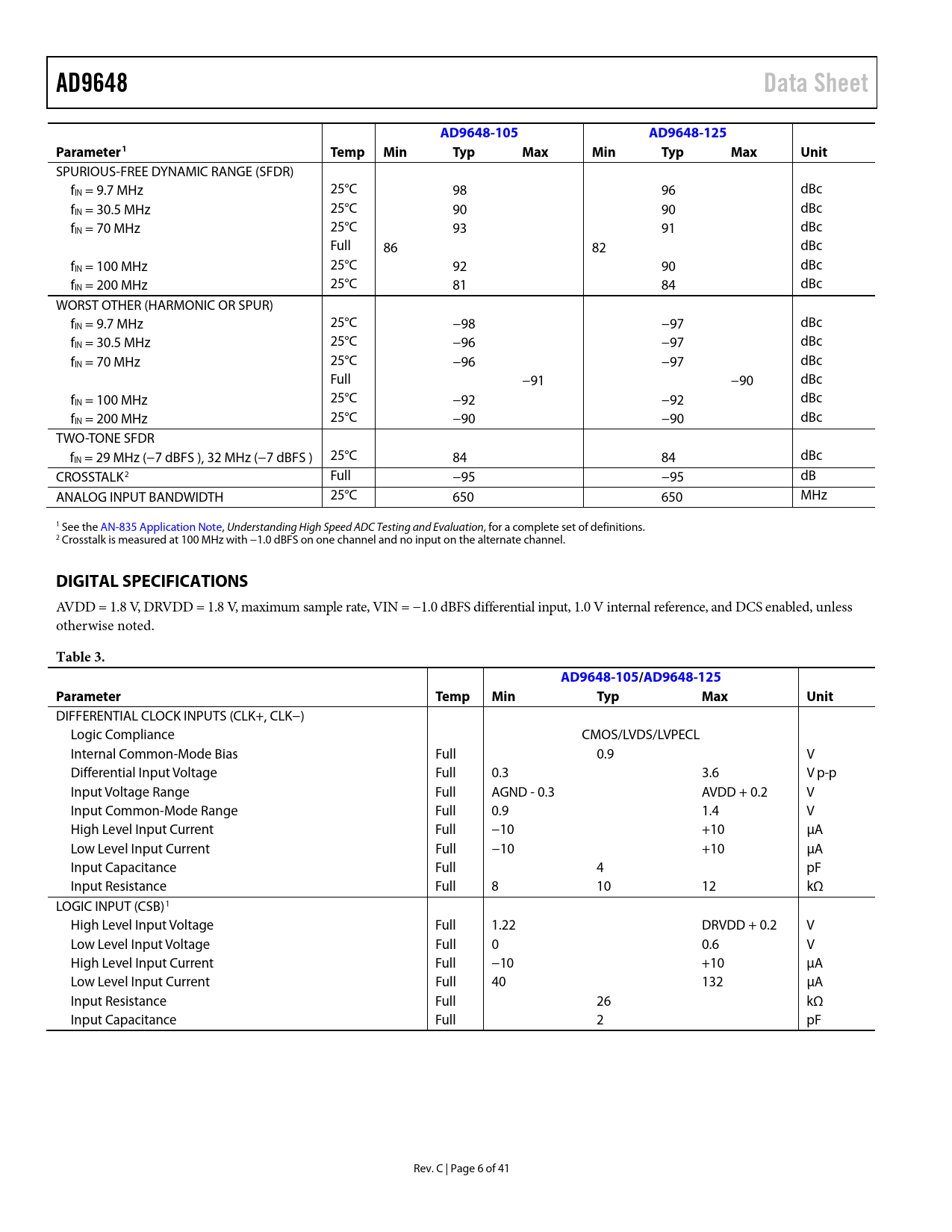 AD9648 Data Sheet AD9648-105 AD9648-125 Parameter1 Temp Min Typ Max Min Unit DIGITAL SPECIFICATIONS Table 3 AD9648-105/AD9648-125