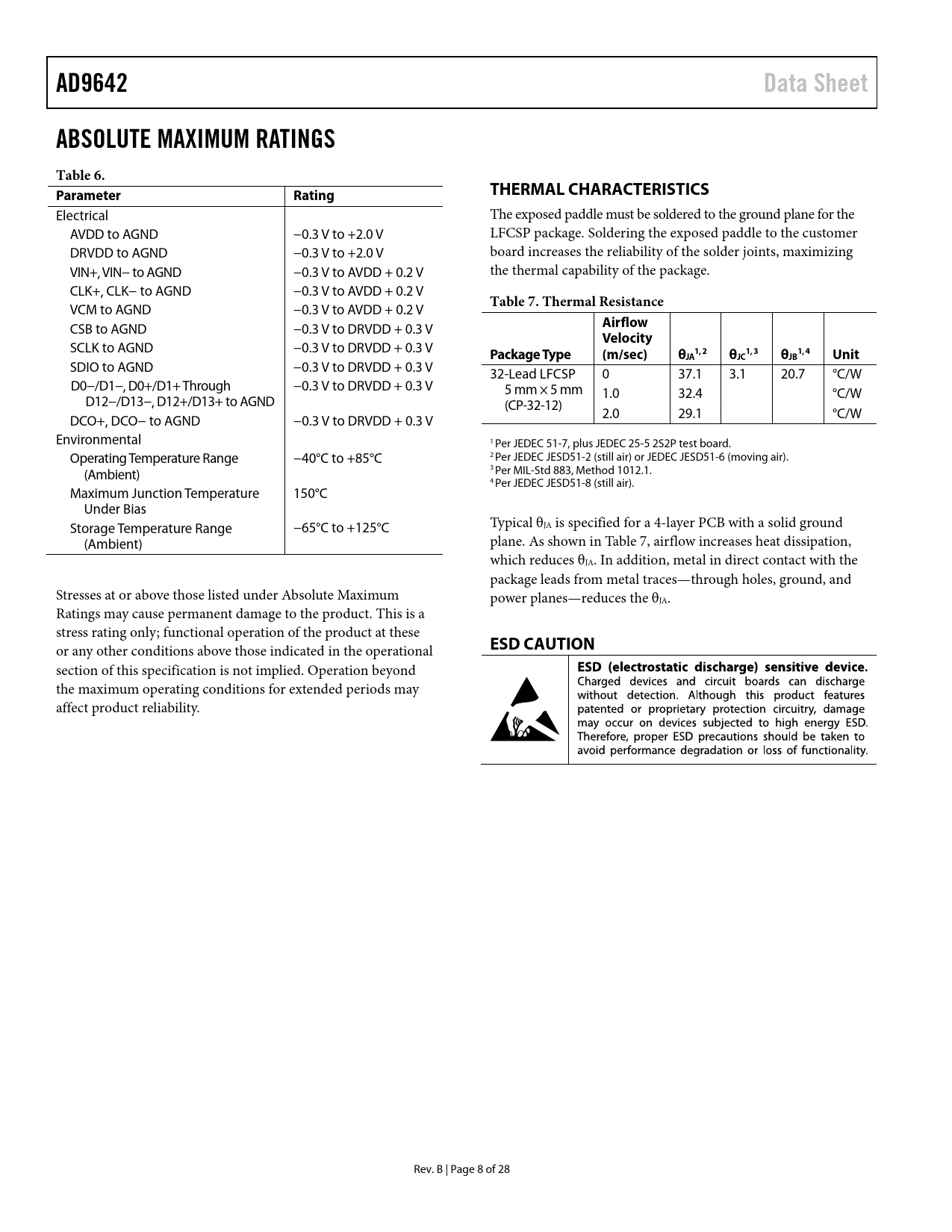 AD9642 Data Sheet ABSOLUTE MAXIMUM RATINGS Table 6 Parameter Rating THERMAL CHARACTERISTICS Table 7 Thermal Resistance