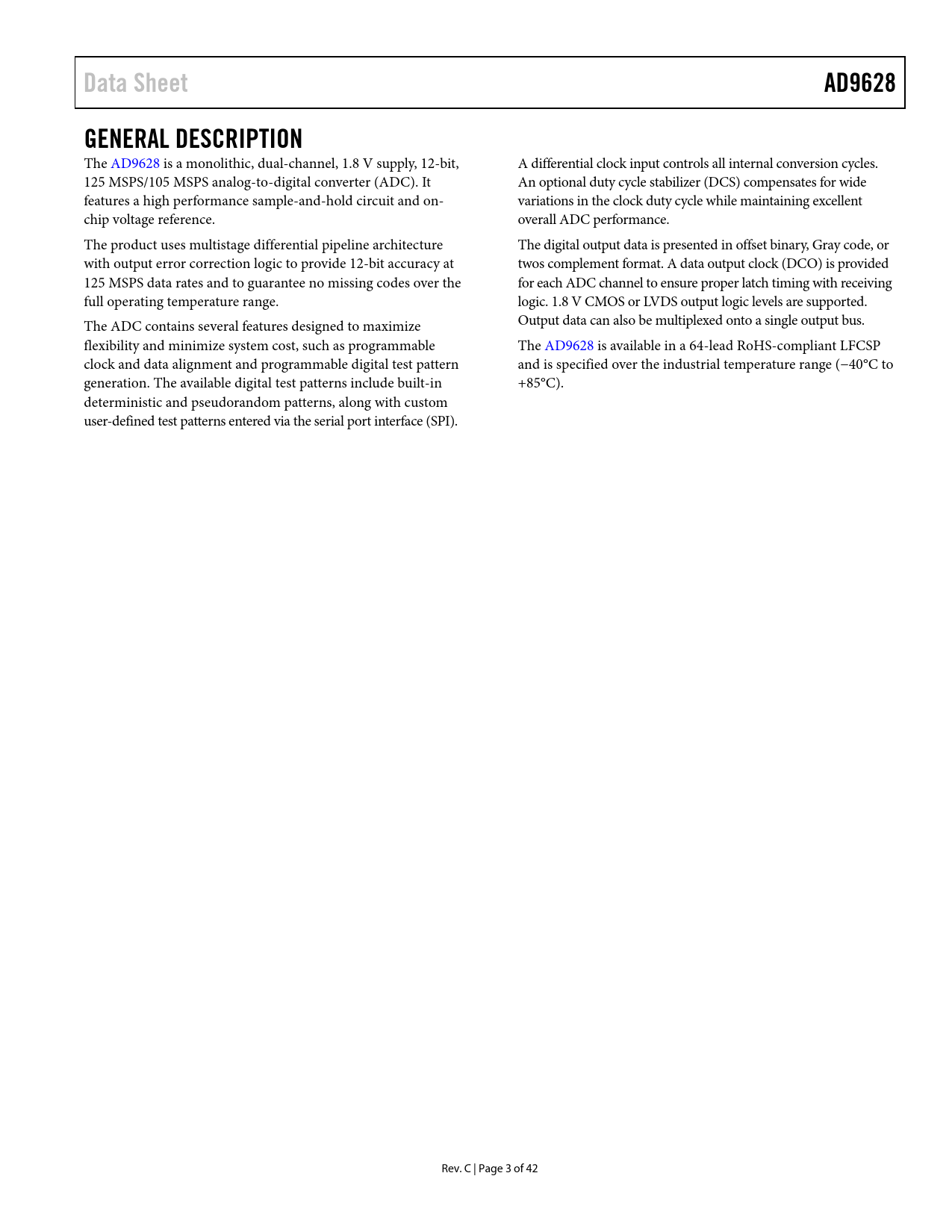 Data SheetAD9628GENERAL DESCRIPTION The AD9628 is a monolithic, dual-channel, 1.8 V supply, 12-bit, A differential clock input controls al internal conversion cycles. 125 MSPS/105 MSPS analog-to-digital converter (ADC). It An optional duty cycle stabilizer (DCS) compensates for wide features a high performance sample-and-hold circuit and on- variations in the clock duty cycle while maintaining excel ent chip voltage reference. overal ADC performance. The product uses multistage differential pipeline architecture The digital output data is presented in offset binary, Gray code, or with output error correction logic to provide 12-bit accuracy at twos complement format. A data output clock (DCO) is provided 125 MSPS data rates and to guarantee no missing codes over the for each ADC channel to ensure proper latch timing with receiving ful operating temperature range. logic. 1.8 V CMOS or LVDS output logic levels are supported. The ADC contains several features designed to maximize Output data can also be multiplexed onto a single output bus. flexibility and minimize system cost, such as programmable The AD9628 is available in a 64-lead RoHS-compliant LFCSP clock and data alignment and programmable digital test pattern and is specified over the industrial temperature range (−40°C to generation. The available digital test patterns include built-in +85°C). deterministic and pseudorandom patterns, along with custom user-defined test patterns entered via the serial port interface (SPI). Rev. C | Page 3 of 42 Document Outline FEATURES APPLICATIONS FUNCTIONAL BLOCK DIAGRAM PRODUCT HIGHLIGHTS REVISION HISTORY GENERAL DESCRIPTION SPECIFICATIONS DC SPECIFICATIONS AC SPECIFICATIONS DIGITAL SPECIFICATIONS SWITCHING SPECIFICATIONS TIMING SPECIFICATIONS Timing Diagrams ABSOLUTE MAXIMUM RATINGS THERMAL CHARACTERISTICS ESD CAUTION PIN CONFIGURATIONS AND FUNCTION DESCRIPTIONS TYPICAL PERFORMANCE CHARACTERISTICS AD9628-125 AD9628-105 EQUIVALENT CIRCUITS THEORY OF OPERATION ADC ARCHITECTURE ANALOG INPUT CONSIDERATIONS Input Common Mode Differential Input Configurations VOLTAGE REFERENCE Internal Reference Connection External Reference Operation CLOCK INPUT CONSIDERATIONS Clock Input Options Input Clock Divider Clock Duty Cycle Jitter Considerations CHANNEL/CHIP SYNCHRONIZATION POWER DISSIPATION AND STANDBY MODE DIGITAL OUTPUTS Digital Output Enable Function (OEB) TIMING Data Clock Output (DCO) OUTPUT TEST OUTPUT TEST MODES SERIAL PORT INTERFACE (SPI) CONFIGURATION USING THE SPI HARDWARE INTERFACE CONFIGURATION WITHOUT THE SPI SPI ACCESSIBLE FEATURES MEMORY MAP READING THE MEMORY MAP REGISTER TABLE Open Locations Default Values Logic Levels Channel-Specific Registers MEMORY MAP REGISTER TABLE MEMORY MAP REGISTER DESCRIPTIONS Power Modes (Register 0x08) Bits[7:6]—Open Bits[1:0]—Internal Power-Down Mode Enhancement Control (Register 0x0C) Bits[7:3]—Open Bit 2—Chop Mode Bits[1:0]—Open Output Mode (Register 0x14) Bits[7:6]—Output Port Logic Type Bit 5—Output Interleave Enable Bit 4—Output Port Disable Sync Control (Register 0x3A) Bits[7:3]—Open Bit 2—Clock Divider Next Sync Only Bit 1—Clock Divider Sync Enable Bit 0—Open Transfer (Register 0xFF) Sample Rate Override (Register 0x100) User I/O Control 2 (Register 0x101) Bit 7—OEB Pin Enable Bits[6:1]—Open Bit 0—SDIO Pull-Down User I/O Control 3 (Register 0x102) Bits[7:4]—Open Bit 3—VCM Power-Down Bits[2:0]—Open APPLICATIONS INFORMATION DESIGN GUIDELINES Power and Ground Recommendations LVDS Operation Clock Stability Considerations Exposed Paddle Thermal Heat Slug Recommendations VCM Reference Decoupling SPI Port OUTLINE DIMENSIONS ORDERING GUIDE