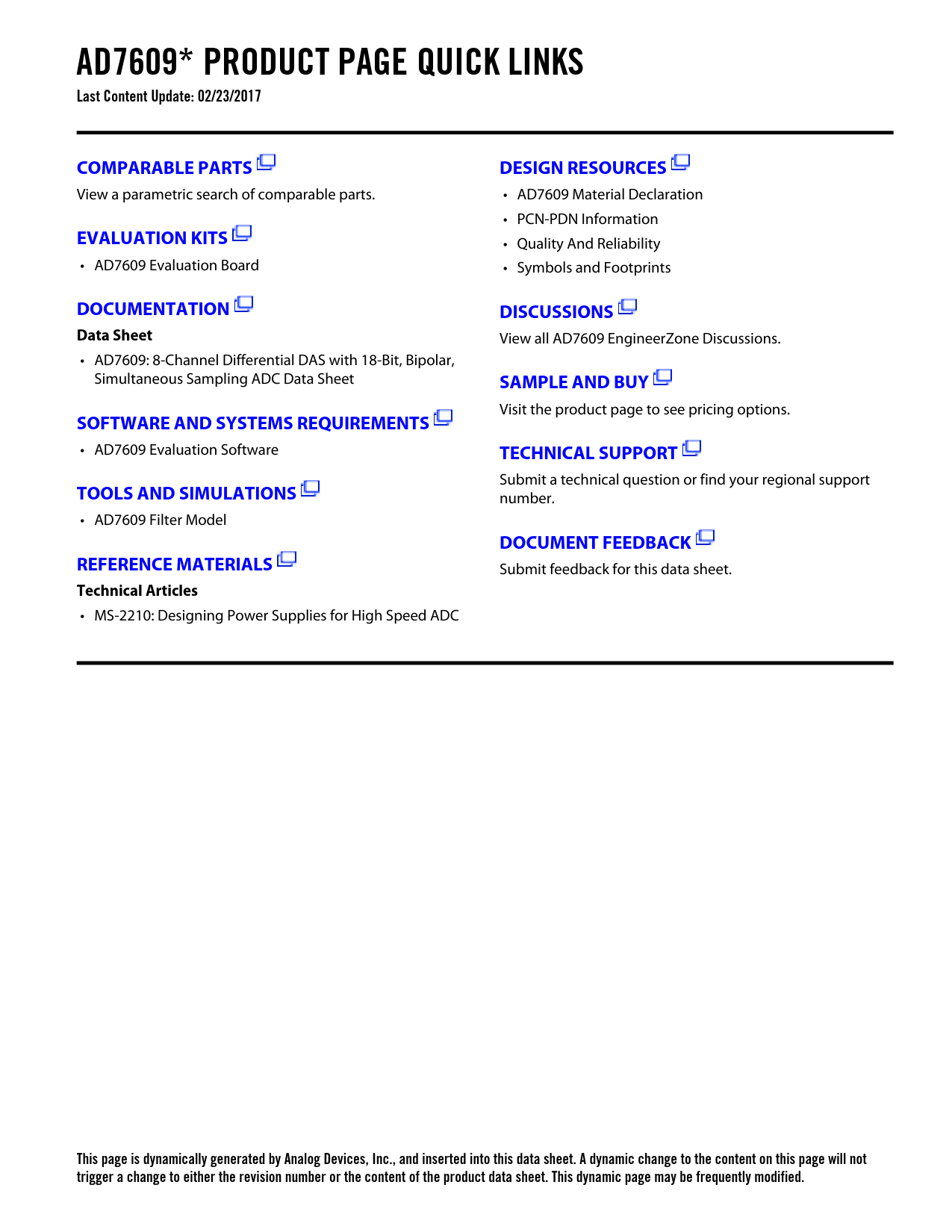 AD7609* PRODUCT PAGE QUICK LINKS Last Content Update: 02/23/2017COMPARABLE PARTSDESIGN RESOURCES View a parametric search of comparable parts. • AD7609 Material Declaration • PCN-PDN Information EVALUATION KITS • Quality And Reliability • AD7609 Evaluation Board • Symbols and Footprints DOCUMENTATIONDISCUSSIONSData Sheet View all AD7609 EngineerZone Discussions. • AD7609: 8-Channel Differential DAS with 18-Bit, Bipolar, Simultaneous Sampling ADC Data Sheet SAMPLE AND BUY Visit the product page to see pricing options. SOFTWARE AND SYSTEMS REQUIREMENTS • AD7609 Evaluation Software TECHNICAL SUPPORT Submit a technical question or find your regional support TOOLS AND SIMULATIONS number. • AD7609 Filter Model DOCUMENT FEEDBACKREFERENCE MATERIALS Submit feedback for this data sheet. Technical Articles • MS-2210: Designing Power Supplies for High Speed ADC This page is dynamically generated by Analog Devices, Inc., and inserted into this data sheet. A dynamic change to the content on this page will not trigger a change to either the revision number or the content of the product data sheet. This dynamic page may be frequently modified. Document Outline Features Applications Companion Products Functional Block Diagram Table of Contents Revision History General Description Specifications Timing Specifications Timing Diagrams Absolute Maximum Ratings Thermal Resistance ESD Caution Pin Configuration and Function Descriptions Typical Performance Characteristics Terminology Theory of Operation Converter Details Analog Input Analog Input Ranges Analog Input Impedance Analog Input Clamp Protection Analog Input Antialiasing Filter Track-and-Hold Amplifiers ADC Transfer Function Internal/External Reference External Reference Mode Internal Reference Mode Typical Connection Diagram Power-Down Modes Conversion Control Simultaneous Sampling on All Analog Input Channels Simultaneously Sampling Two Sets of Channels Digital Interface Parallel Interface (/PAR/SER SEL = 0) Serial Interface (/PAR/SER SEL = 1) Reading During Conversion Digital Filter Layout Guidelines Outline Dimensions Ordering Guide
