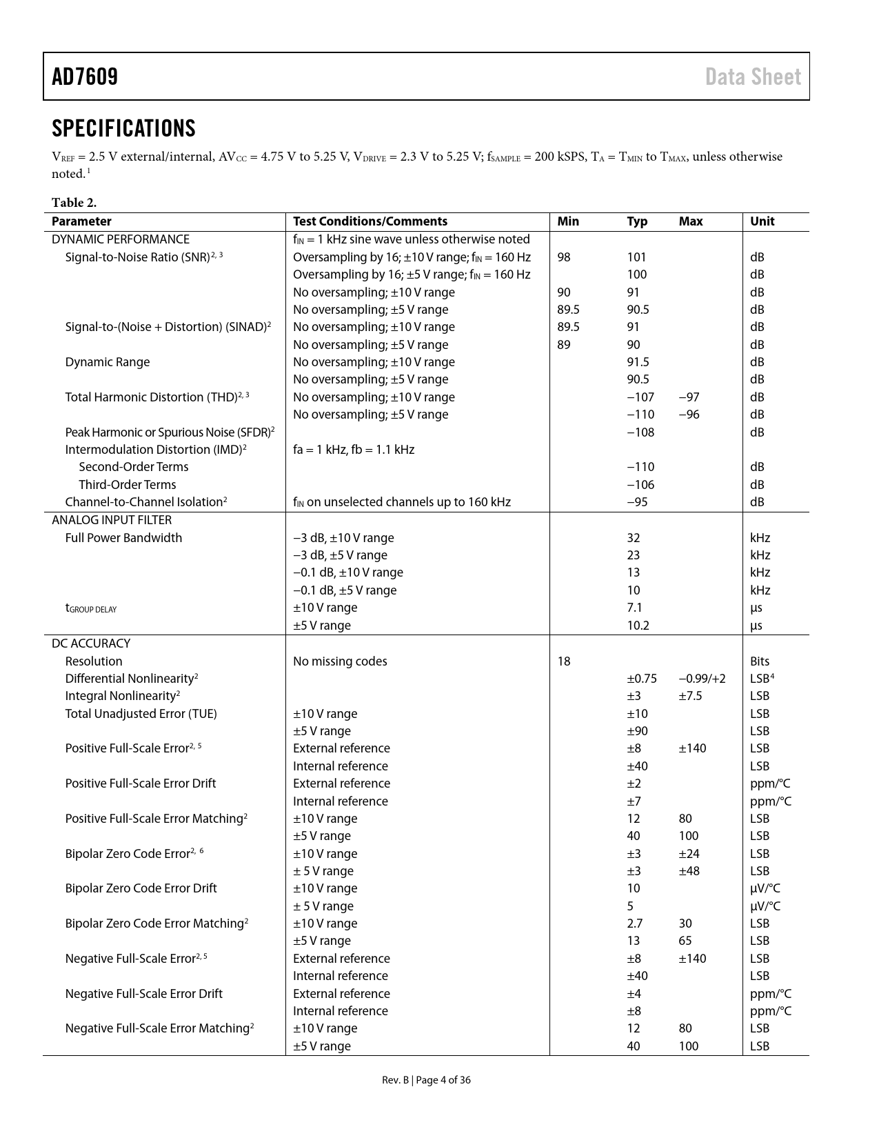 Pages / Page37 / 5 — AD7609. Data Sheet. SPECIFICATIONS. Table 2. Parameter. Test …