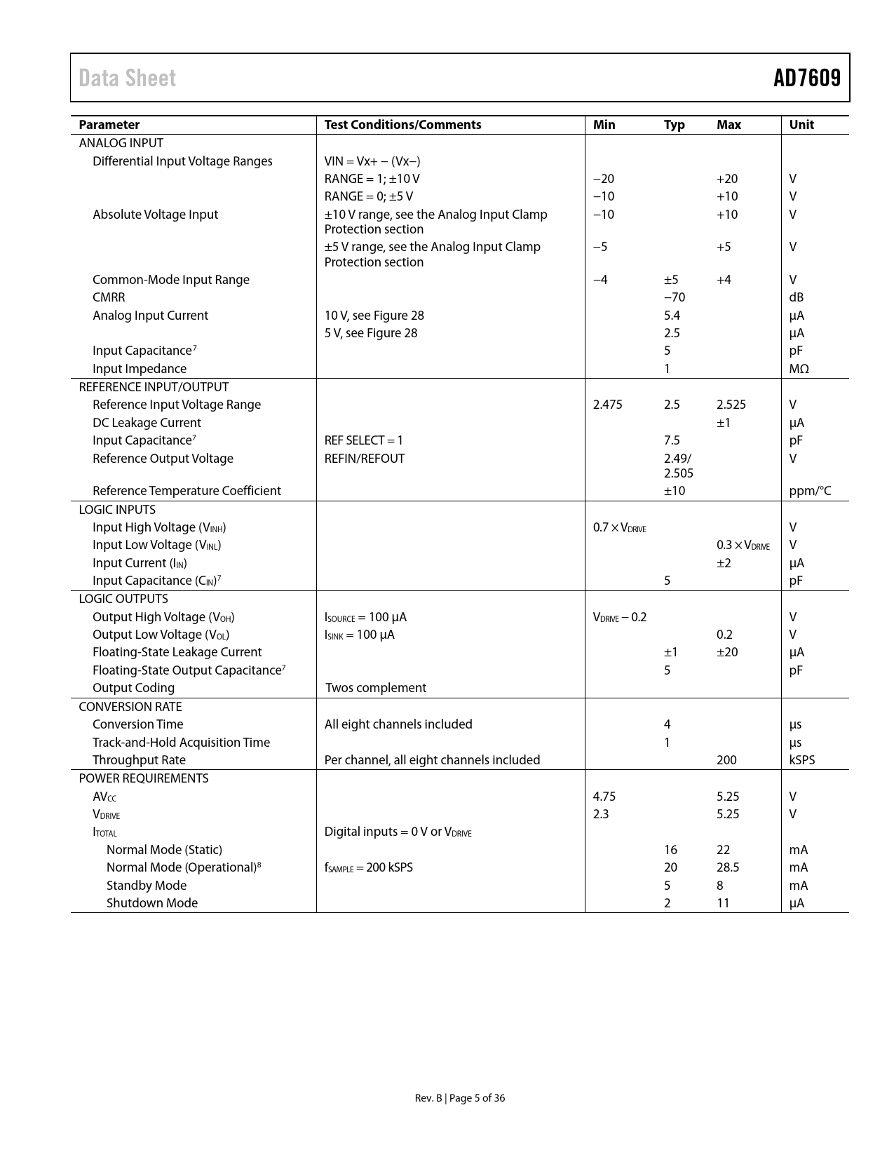 Pages / Page37 / 6 — Data Sheet. AD7609. Parameter. Test Conditions/Comments. Min. Typ. Max. …