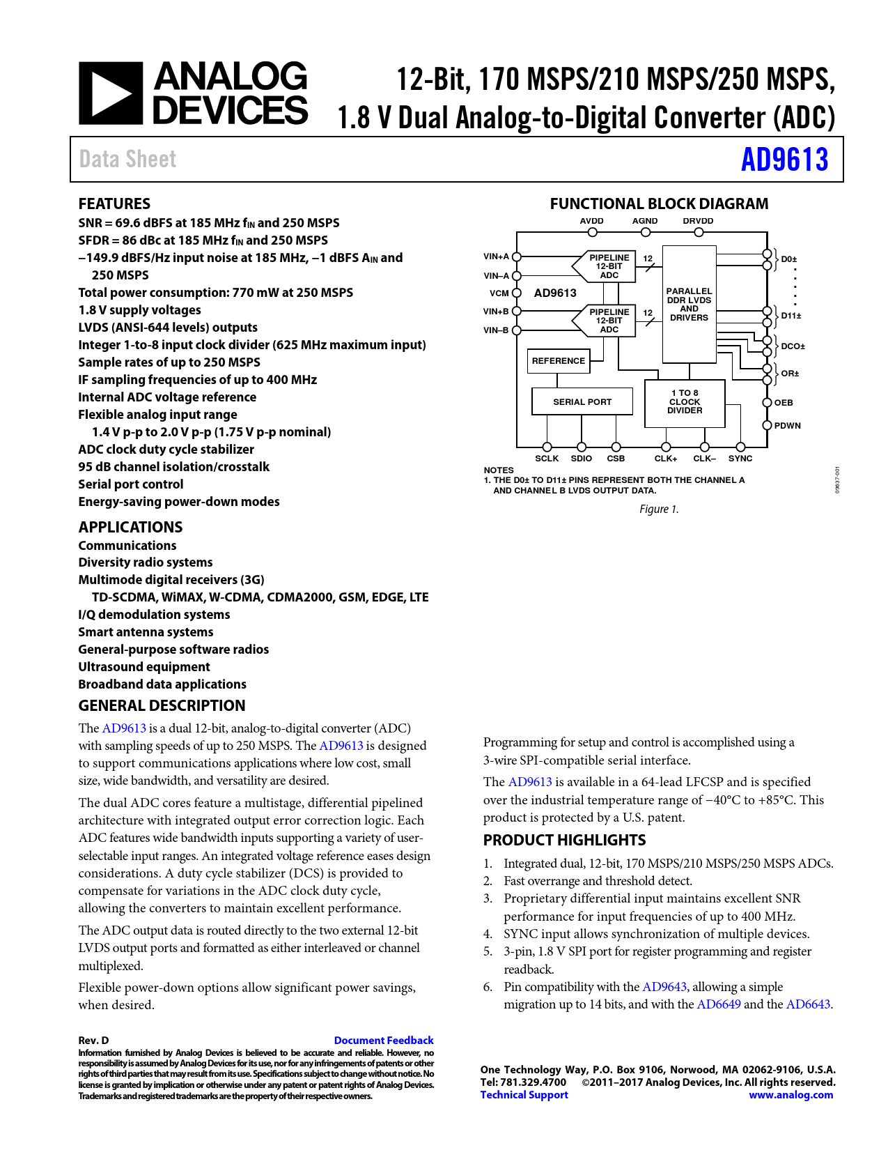 12-Bit, 170 MSPS/210 MSPS/250 MSPS,. 1.8 V Dual Analog-to-Digital Converter (ADC). Data Sheet. AD9613. FEATURES