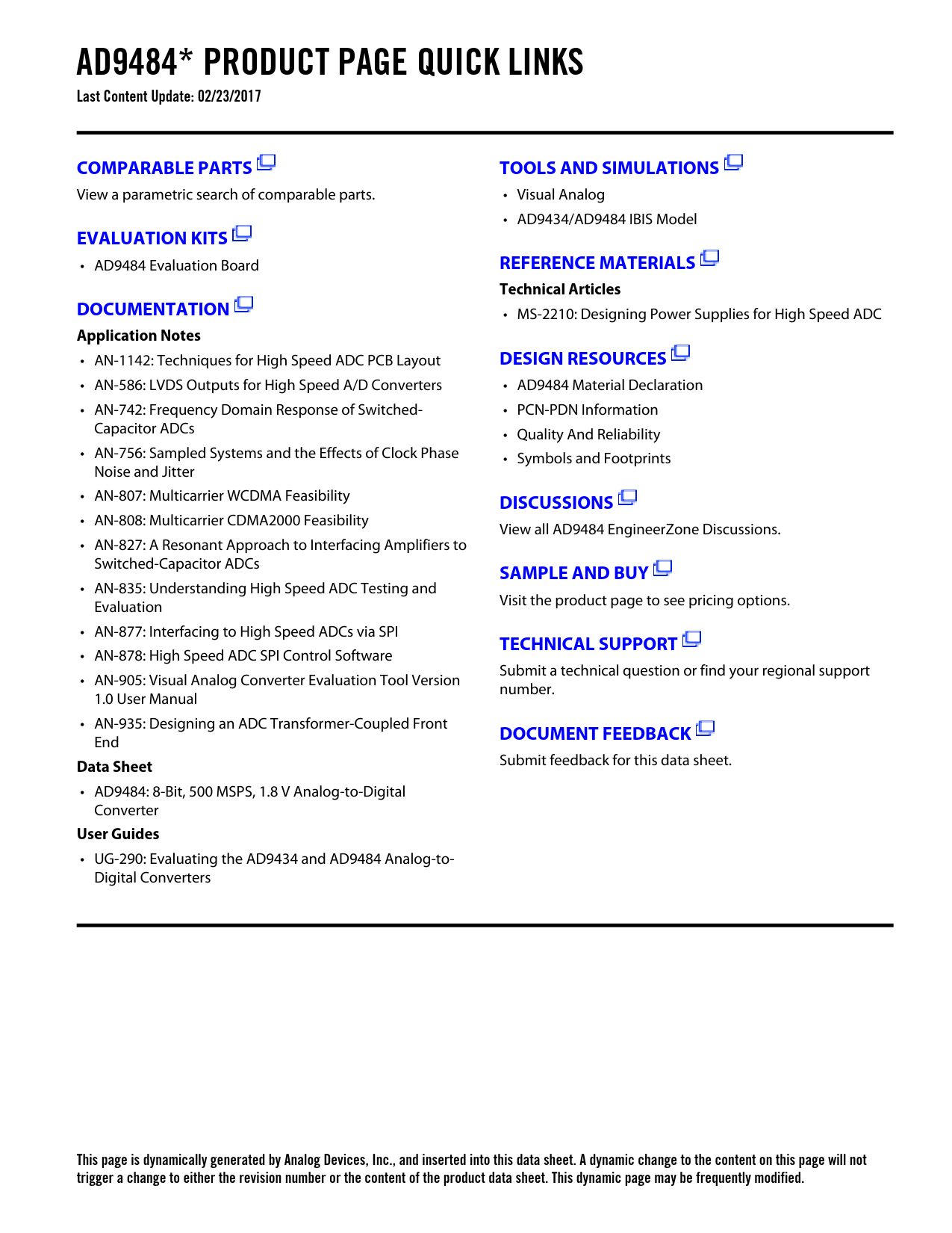 AD9484* PRODUCT PAGE QUICK LINKS Last Content Update: 02/23/2017COMPARABLE PARTSTOOLS AND SIMULATIONS View a parametric search of comparable parts. • Visual Analog • AD9434/AD9484 IBIS Model EVALUATION KITS • AD9484 Evaluation Board REFERENCE MATERIALSTechnical ArticlesDOCUMENTATION • MS-2210: Designing Power Supplies for High Speed ADC Application Notes • AN-1142: Techniques for High Speed ADC PCB Layout DESIGN RESOURCES • AN-586: LVDS Outputs for High Speed A/D Converters • AD9484 Material Declaration • AN-742: Frequency Domain Response of Switched- • PCN-PDN Information Capacitor ADCs • Quality And Reliability • AN-756: Sampled Systems and the Effects of Clock Phase • Symbols and Footprints Noise and Jitter • AN-807: Multicarrier WCDMA Feasibility DISCUSSIONS • AN-808: Multicarrier CDMA2000 Feasibility View all AD9484 EngineerZone Discussions. • AN-827: A Resonant Approach to Interfacing Amplifiers to Switched-Capacitor ADCs SAMPLE AND BUY • AN-835: Understanding High Speed ADC Testing and Evaluation Visit the product page to see pricing options. • AN-877: Interfacing to High Speed ADCs via SPI TECHNICAL SUPPORT • AN-878: High Speed ADC SPI Control Software Submit a technical question or find your regional support • AN-905: Visual Analog Converter Evaluation Tool Version number. 1.0 User Manual • AN-935: Designing an ADC Transformer-Coupled Front DOCUMENT FEEDBACK End Data Sheet Submit feedback for this data sheet. • AD9484: 8-Bit, 500 MSPS, 1.8 V Analog-to-Digital Converter User Guides • UG-290: Evaluating the AD9434 and AD9484 Analog-to- Digital Converters This page is dynamically generated by Analog Devices, Inc., and inserted into this data sheet. A dynamic change to the content on this page will not trigger a change to either the revision number or the content of the product data sheet. This dynamic page may be frequently modified. Document Outline FEATURES APPLICATIONS FUNCTIONAL BLOCK DIAGRAM GENERAL DESCRIPTION PRODUCT HIGHLIGHTS TABLE OF CONTENTS REVISION HISTORY SPECIFICATIONS DC SPECIFICATIONS AC SPECIFICATIONS DIGITAL SPECIFICATIONS SWITCHING SPECIFICATIONS Timing Diagram ABSOLUTE MAXIMUM RATINGS THERMAL RESISTANCE ESD CAUTION PIN CONFIGURATION AND FUNCTION DESCRIPTIONS TYPICAL PERFORMANCE CHARACTERISTICS EQUIVALENT CIRCUITS THEORY OF OPERATION ANALOG INPUT AND VOLTAGE REFERENCE Differential Input Configurations CLOCK INPUT CONSIDERATIONS Clock Duty Cycle Considerations Clock Jitter Considerations POWER DISSIPATION AND POWER-DOWN MODE DIGITAL OUTPUTS Digital Outputs and Timing Output Data Rate and Pinout Configuration Out-of-Range (OR) TIMING VREF AD9484 CONFIGURATION USING THE SPI HARDWARE INTERFACE CONFIGURATION WITHOUT THE SPI MEMORY MAP READING THE MEMORY MAP TABLE RESERVED LOCATIONS DEFAULT VALUES LOGIC LEVELS OUTLINE DIMENSIONS ORDERING GUIDE
