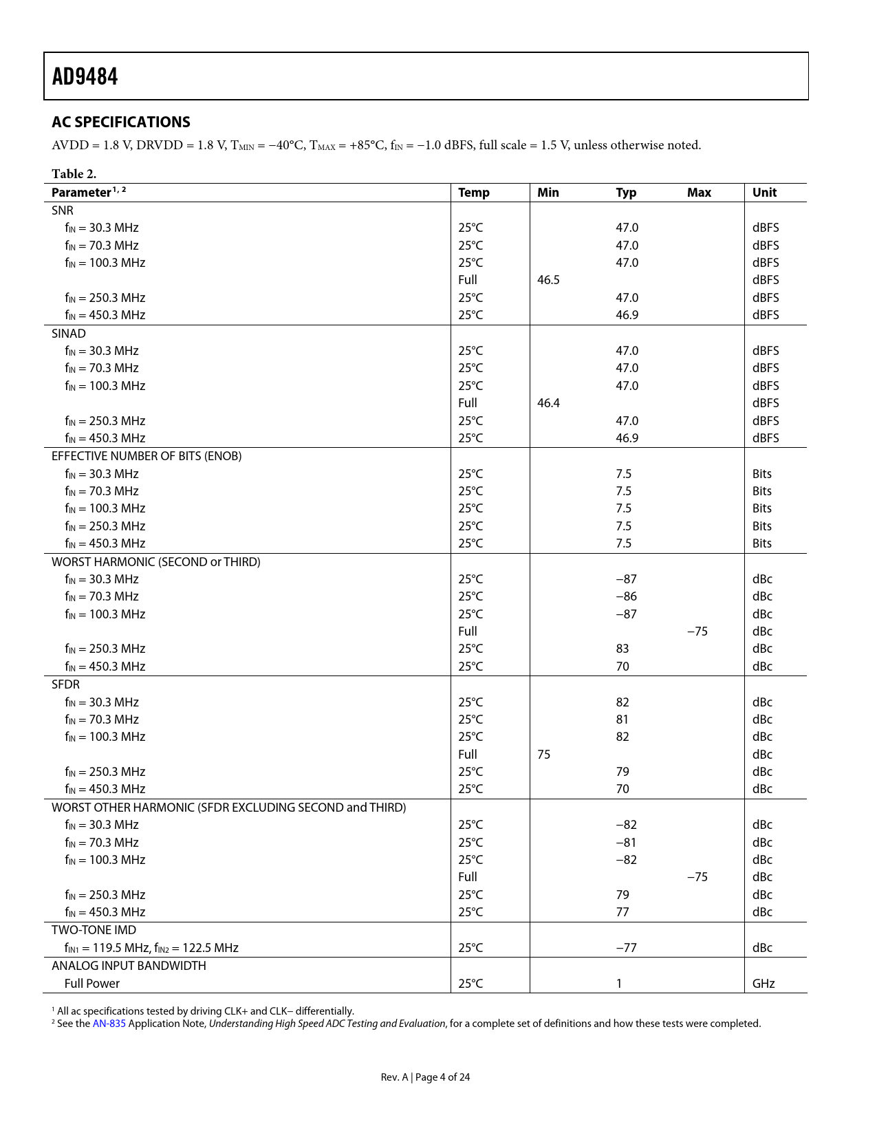 AD9484 AC SPECIFICATIONS Table 2 Parameter Temp Min Typ Max Unit