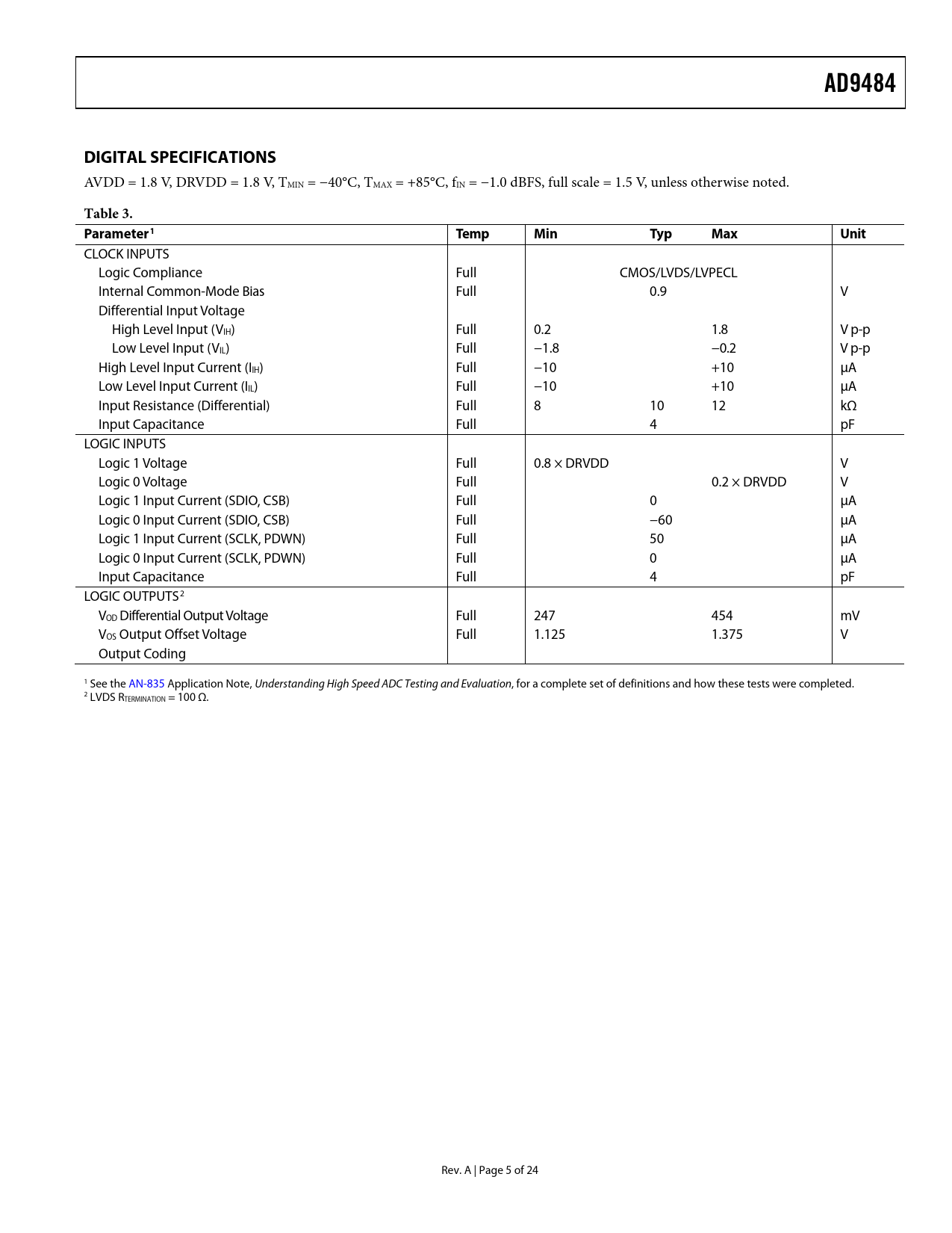 link to page 25 link to page 25 link to page 6 link to page 6 AD9484DIGITAL SPECIFICATIONS AVDD = 1.8 V, DRVDD = 1.8 V, TMIN = −40°C, TMAX = +85°C, fIN = −1.0 dBFS, full scale = 1.5 V, unless otherwise noted. Table 3. Parameter1TempMinTypMaxUnit CLOCK INPUTS Logic Compliance Full CMOS/LVDS/LVPECL Internal Common-Mode Bias Full 0.9 V Differential Input Voltage High Level Input (VIH) Full 0.2 1.8 V p-p Low Level Input (VIL) Full −1.8 −0.2 V p-p High Level Input Current (IIH) Full −10 +10 μA Low Level Input Current (IIL) Full −10 +10 μA Input Resistance (Differential) Full 8 10 12 kΩ Input Capacitance Full 4 pF LOGIC INPUTS Logic 1 Voltage Full 0.8 × DRVDD V Logic 0 Voltage Full 0.2 × DRVDD V Logic 1 Input Current (SDIO, CSB) Full 0 μA Logic 0 Input Current (SDIO, CSB) Full −60 μA Logic 1 Input Current (SCLK, PDWN) Full 50 μA Logic 0 Input Current (SCLK, PDWN) Full 0 μA Input Capacitance Full 4 pF LOGIC OUTPUTS2 VOD Differential Output Voltage Full 247 454 mV VOS Output Offset Voltage Full 1.125 1.375 V Output Coding 1 See the AN-835 Application Note, Understanding High Speed ADC Testing and Evaluation, for a complete set of definitions and how these tests were completed. 2 LVDS RTERMINATION = 100 Ω. Rev. A | Page 5 of 24 Document Outline FEATURES APPLICATIONS FUNCTIONAL BLOCK DIAGRAM GENERAL DESCRIPTION PRODUCT HIGHLIGHTS TABLE OF CONTENTS REVISION HISTORY SPECIFICATIONS DC SPECIFICATIONS AC SPECIFICATIONS DIGITAL SPECIFICATIONS SWITCHING SPECIFICATIONS Timing Diagram ABSOLUTE MAXIMUM RATINGS THERMAL RESISTANCE ESD CAUTION PIN CONFIGURATION AND FUNCTION DESCRIPTIONS TYPICAL PERFORMANCE CHARACTERISTICS EQUIVALENT CIRCUITS THEORY OF OPERATION ANALOG INPUT AND VOLTAGE REFERENCE Differential Input Configurations CLOCK INPUT CONSIDERATIONS Clock Duty Cycle Considerations Clock Jitter Considerations POWER DISSIPATION AND POWER-DOWN MODE DIGITAL OUTPUTS Digital Outputs and Timing Output Data Rate and Pinout Configuration Out-of-Range (OR) TIMING VREF AD9484 CONFIGURATION USING THE SPI HARDWARE INTERFACE CONFIGURATION WITHOUT THE SPI MEMORY MAP READING THE MEMORY MAP TABLE RESERVED LOCATIONS DEFAULT VALUES LOGIC LEVELS OUTLINE DIMENSIONS ORDERING GUIDE
