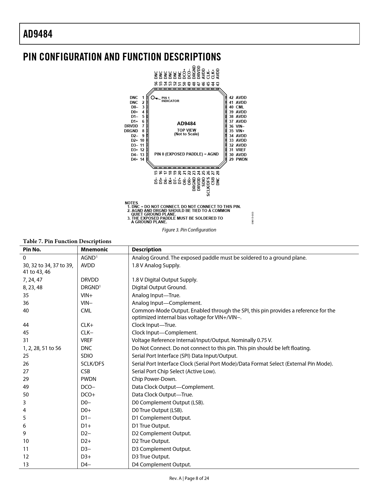 link to page 25 link to page 9 link to page 10 link to page 10 AD9484PIN CONFIGURATION AND FUNCTION DESCRIPTIONSDD+–NDD–+DCCCCCCOOGVDKKDNNNNNNCCRRVLLVDDDDDDDDDDACCA6543210987655555543554444444DNC 1PIN 142 AVDDINDICATORDNC 241 AVDDD0– 340 CMLD0+ 439 AVDDD1– 538 AVDDD1+ 637 AVDDAD9484DRVDD 736 VIN–DRGND 8TOP VIEW35 VIN+D2– 9(Not to Scale)34 AVDDD2+ 1033 AVDDD3– 1132 AVDDD3+ 1231 VREFD4– 13PIN 0 (EXPOSED PADDLE) = AGND30 AVDDD4+ 1429 PWDN5678011119112222 32 42 52 62 72 82–++–5+––+56677SRDDOIBCDRFDDDDDNDSNOOGVDD/ C DRRSKDDL C SNOTES1. DNC = DO NOT CONNECT. DO NOT CONNECT TO THIS PIN.2. AGND AND DRGND SHOULD BE TIED TO A COMMONQUIET GROUND PLANE. 3 3. THE EXPOSED PADDLE MUST BE SOLDERED TO -00 A GROUND PLANE. 615 09 Figure 3. Pin Configuration Table 7. Pin Function Descriptions Pin No.MnemonicDescription 0 AGND1 Analog Ground. The exposed paddle must be soldered to a ground plane. 30, 32 to 34, 37 to 39, AVDD 1.8 V Analog Supply. 41 to 43, 46 7, 24, 47 DRVDD 1.8 V Digital Output Supply. 8, 23, 48 DRGND1 Digital Output Ground. 35 VIN+ Analog Input—True. 36 VIN− Analog Input—Complement. 40 CML Common-Mode Output. Enabled through the SPI, this pin provides a reference for the optimized internal bias voltage for VIN+/VIN−. 44 CLK+ Clock Input—True. 45 CLK− Clock Input—Complement. 31 VREF Voltage Reference Internal/Input/Output. Nominally 0.75 V. 1, 2, 28, 51 to 56 DNC Do Not Connect. Do not connect to this pin. This pin should be left floating. 25 SDIO Serial Port Interface (SPI) Data Input/Output. 26 SCLK/DFS Serial Port Interface Clock (Serial Port Mode)/Data Format Select (External Pin Mode). 27 CSB Serial Port Chip Select (Active Low). 29 PWDN Chip Power-Down. 49 DCO− Data Clock Output—Complement. 50 DCO+ Data Clock Output—True. 3 D0− D0 Complement Output (LSB). 4 D0+ D0 True Output (LSB). 5 D1− D1 Complement Output. 6 D1+ D1 True Output. 9 D2− D2 Complement Output. 10 D2+ D2 True Output. 11 D3− D3 Complement Output. 12 D3+ D3 True Output. 13 D4− D4 Complement Output. Rev. A | Page 8 of 24 Document Outline FEATURES APPLICATIONS FUNCTIONAL BLOCK DIAGRAM GENERAL DESCRIPTION PRODUCT HIGHLIGHTS TABLE OF CONTENTS REVISION HISTORY SPECIFICATIONS DC SPECIFICATIONS AC SPECIFICATIONS DIGITAL SPECIFICATIONS SWITCHING SPECIFICATIONS Timing Diagram ABSOLUTE MAXIMUM RATINGS THERMAL RESISTANCE ESD CAUTION PIN CONFIGURATION AND FUNCTION DESCRIPTIONS TYPICAL PERFORMANCE CHARACTERISTICS EQUIVALENT CIRCUITS THEORY OF OPERATION ANALOG INPUT AND VOLTAGE REFERENCE Differential Input Configurations CLOCK INPUT CONSIDERATIONS Clock Duty Cycle Considerations Clock Jitter Considerations POWER DISSIPATION AND POWER-DOWN MODE DIGITAL OUTPUTS Digital Outputs and Timing Output Data Rate and Pinout Configuration Out-of-Range (OR) TIMING VREF AD9484 CONFIGURATION USING THE SPI HARDWARE INTERFACE CONFIGURATION WITHOUT THE SPI MEMORY MAP READING THE MEMORY MAP TABLE RESERVED LOCATIONS DEFAULT VALUES LOGIC LEVELS OUTLINE DIMENSIONS ORDERING GUIDE