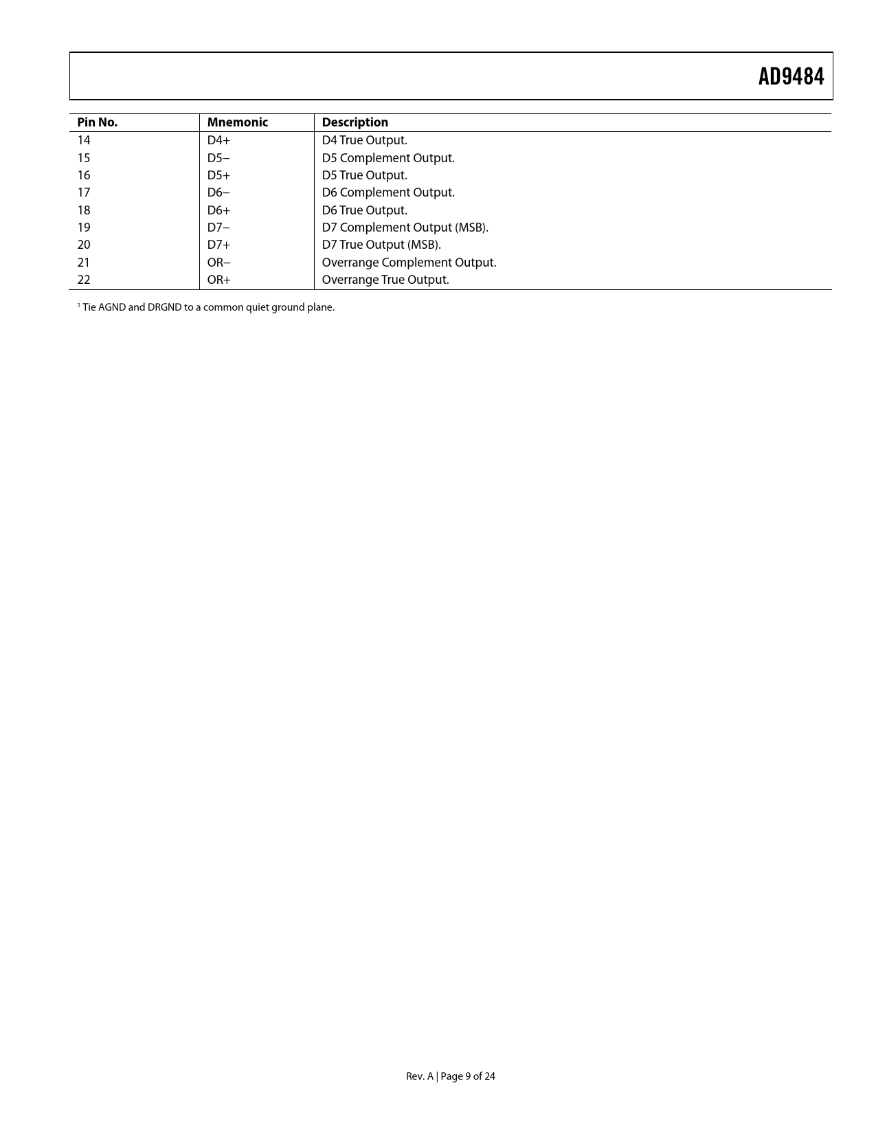 AD9484. Pin No. Mnemonic. Description