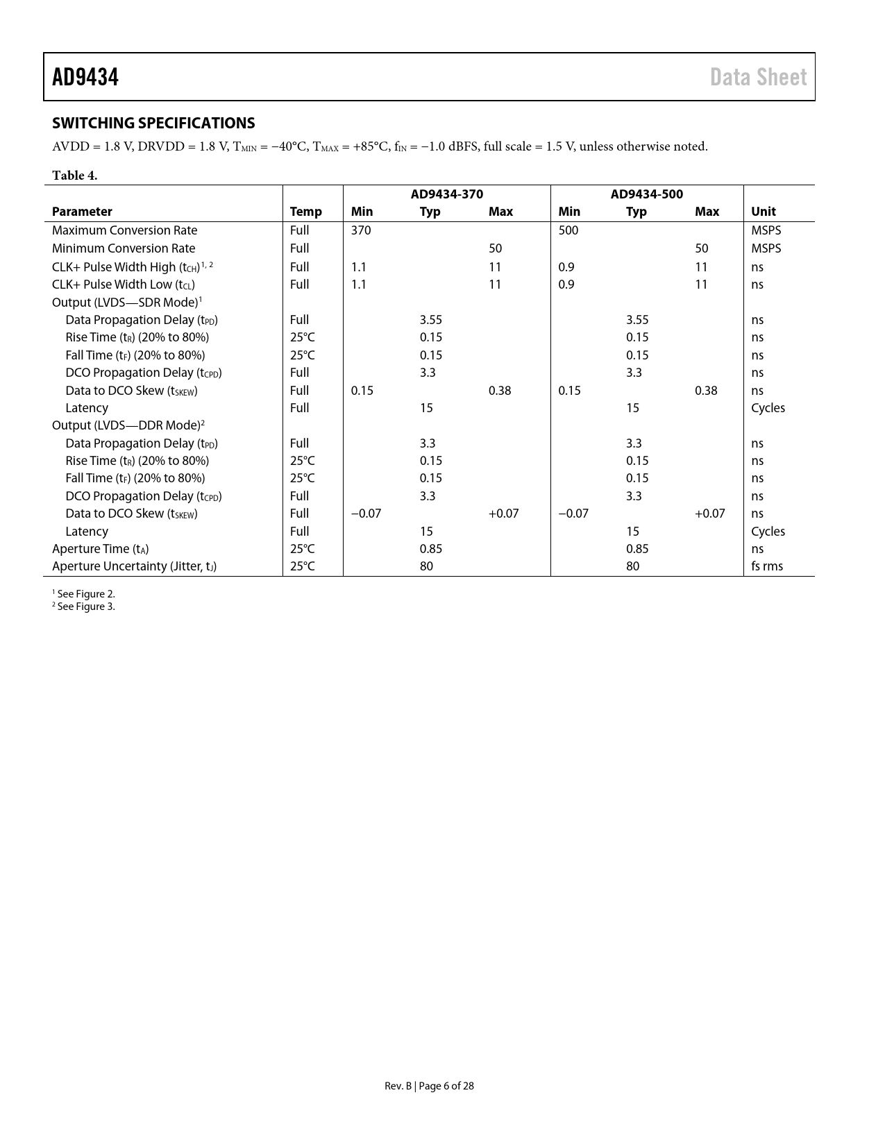 link to page 8 link to page 8 link to page 7 link to page 7 link to page 7 link to page 7 AD9434Data SheetSWITCHING SPECIFICATIONS AVDD = 1.8 V, DRVDD = 1.8 V, TMIN = −40°C, TMAX = +85°C, fIN = −1.0 dBFS, full scale = 1.5 V, unless otherwise noted. Table 4.AD9434-370AD9434-500ParameterTempMinTypMaxMinTypMaxUnit Maximum Conversion Rate Full 370 500 MSPS Minimum Conversion Rate Full 50 50 MSPS CLK+ Pulse Width High (tCH)1, 2 Full 1.1 11 0.9 11 ns CLK+ Pulse Width Low (tCL) Full 1.1 11 0.9 11 ns Output (LVDS—SDR Mode)1 Data Propagation Delay (tPD) Full 3.55 3.55 ns Rise Time (tR) (20% to 80%) 25°C 0.15 0.15 ns Fall Time (tF) (20% to 80%) 25°C 0.15 0.15 ns DCO Propagation Delay (tCPD) Full 3.3 3.3 ns Data to DCO Skew (tSKEW) Full 0.15 0.38 0.15 0.38 ns Latency Full 15 15 Cycles Output (LVDS—DDR Mode)2 Data Propagation Delay (tPD) Full 3.3 3.3 ns Rise Time (tR) (20% to 80%) 25°C 0.15 0.15 ns Fall Time (tF) (20% to 80%) 25°C 0.15 0.15 ns DCO Propagation Delay (tCPD) Full 3.3 3.3 ns Data to DCO Skew (tSKEW) Full −0.07 +0.07 −0.07 +0.07 ns Latency Full 15 15 Cycles Aperture Time (tA) 25°C 0.85 0.85 ns Aperture Uncertainty (Jitter, tJ) 25°C 80 80 fs rms 1 See Figure 2. 2 See Figure 3. Rev. B | Page 6 of 28 Document Outline Features Applications General Description Functional Block Diagram Product Highlights Revision History Specifications DC Specifications AC Specifications Digital Specifications Switching Specifications Timing Diagrams Absolute Maximum Ratings Thermal Resistance ESD Caution Pin Configurations and Function Descriptions Typical Performance Characteristics Equivalent Circuits Theory of Operation Analog Input and Voltage Reference Differential Input Configurations Clock Input Considerations Clock Duty Cycle Considerations Clock Jitter Considerations Power Dissipation and Power-Down Mode Digital Outputs Digital Outputs and Timing Output Data Rate and Pinout Configuration Out-of-Range (OR) Timing VREF AD9434 Configuration Using the SPI Using the AD9434 to Replace the AD9230 Hardware Interface Configuration Without the SPI Memory Map Reading the Memory Map Table Reserved Locations Default Values Logic Levels Outline Dimensions Ordering Guide