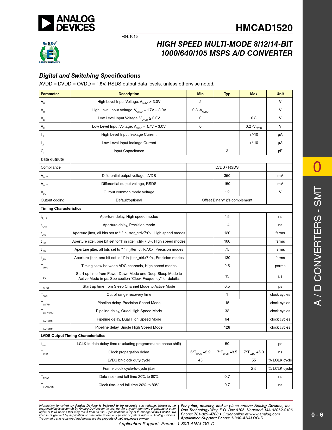 HMCAD1520 v04.1015 HigH Speed Multi-Mode 8/12/14-Bit1000/640/105 MSpS A/d Converterdigital and Switching Specifications AvDD = DvDD = ovDD = 1.8v, rsDs output data levels, unless otherwise noted. ParameterDescriptionMinTypMaxUnit v High Level Input voltage. v ≥ 3.0v 2 v HI ovDD v High Level Input voltage. v = 1.7v – 3.0v 0.8 ·v v HI ovDD ovDD v Low Level Input voltage. v ≥ 3.0v 0 0.8 v LI ovDD v Low Level Input voltage. v = 1.7v – 3.0v 0 0.2 ·v v LI ovDD ovDD I High Level Input leakage Current +/-10 µA HI I Low Level Input leakage Current +/-10 µA LI C Input Capacitance 3 pF I Data outputs Compliance LvDs / rsDs 0 v Differential output voltage, LvDs 350 mv oUt v Differential output voltage, rsDs 150 mv oUt v output common mode voltage 1.2 v t CM output coding Default/optional offset Binary/ 2’s complement M s Timing Characteristics t Aperture delay, High speed modes 1.5 ns A,Hs s - t Aperture delay, Precision mode 1.4 ns A,PM r t Aperture jitter, all bits set to ‘1’ in jitter_ctrl<7:0>, High speed modes 120 fsrms j,Hs e t Aperture jitter, one bit set to ‘1’ in jitter_ctrl<7:0>, High speed modes 160 fsrms t j,Hs r t Aperture jitter, all bits set to ‘1’ in jitter_ctrl<7:0>, Precision modes 75 fsrms j,PM e t Aperture jitter, one bit set to ‘1’ in jitter_ctrl<7:0>, Precision modes 130 fsrms j,PM v t timing skew between ADC channels, High speed modes 2.5 psrms skew n start up time from Power Down Mode and Deep sleep Mode to o t 15 µs sU Active Mode in µs. see section “Clock Frequency” for details. t start up time from sleep Channel Mode to Active Mode 0.5 µs sLPCH t out of range recovery time 1 clock cycles ovr t Pipeline delay, Precision speed Mode 15 clock cycles LAtPM A / D C t Pipeline delay, Quad High speed Mode 32 clock cycles LAtHsMQ t Pipeline delay, Dual High speed Mode 64 clock cycles LAtHsMD t Pipeline delay, single High speed Mode 128 clock cycles LAtHsMs LVDS Output Timing Characteristics t LCLK to data delay time (excluding programmable phase shift) 50 ps data t Clock propagation delay. 6*t +2.2 7*t +3.5 7*t +5.0 ns ProP LvDs LvDs LvDs LvDs bit-clock duty-cycle 45 55 % LCLK cycle Frame clock cycle-to-cycle jitter 2.5 % LCLK cycle t Data rise- and fall time 20% to 80% 0.7 ns eDGe t Clock rise- and fall time 20% to 80% 0.7 ns CLKeDGe Informatio For price, delivery, and to place orders: Analog Devices, Inc., One Technology Way, P.O. Box 9106, Norwood, n furnished by Analog Devices is believed to be accurate and reliable. However, no For price, delivery, and to place orders: Analog Devices, Inc., responsibility is assumed by Analog Devices for its use, nor for any infringements of patents or other MA 02062-9106One Technology Way, P.O. Box 9106, Norwood, MA 02062-9106 rights of third parties that may result from its use. Specifications subject to change without notice. No license is granted by implication or otherwise under any patent or patent rights of Analog Devices. Phone: 781-329-4700 • Order online at www.analog.com 0 - 6 Phone: 781-329-4700 • Order online at www.analog.com Trademarks and registered trademarks are the property of their respective owners. Application Support: Phone: 1-800-ANALOG-D Application Support: Phone: 1-800-ANALOG-D