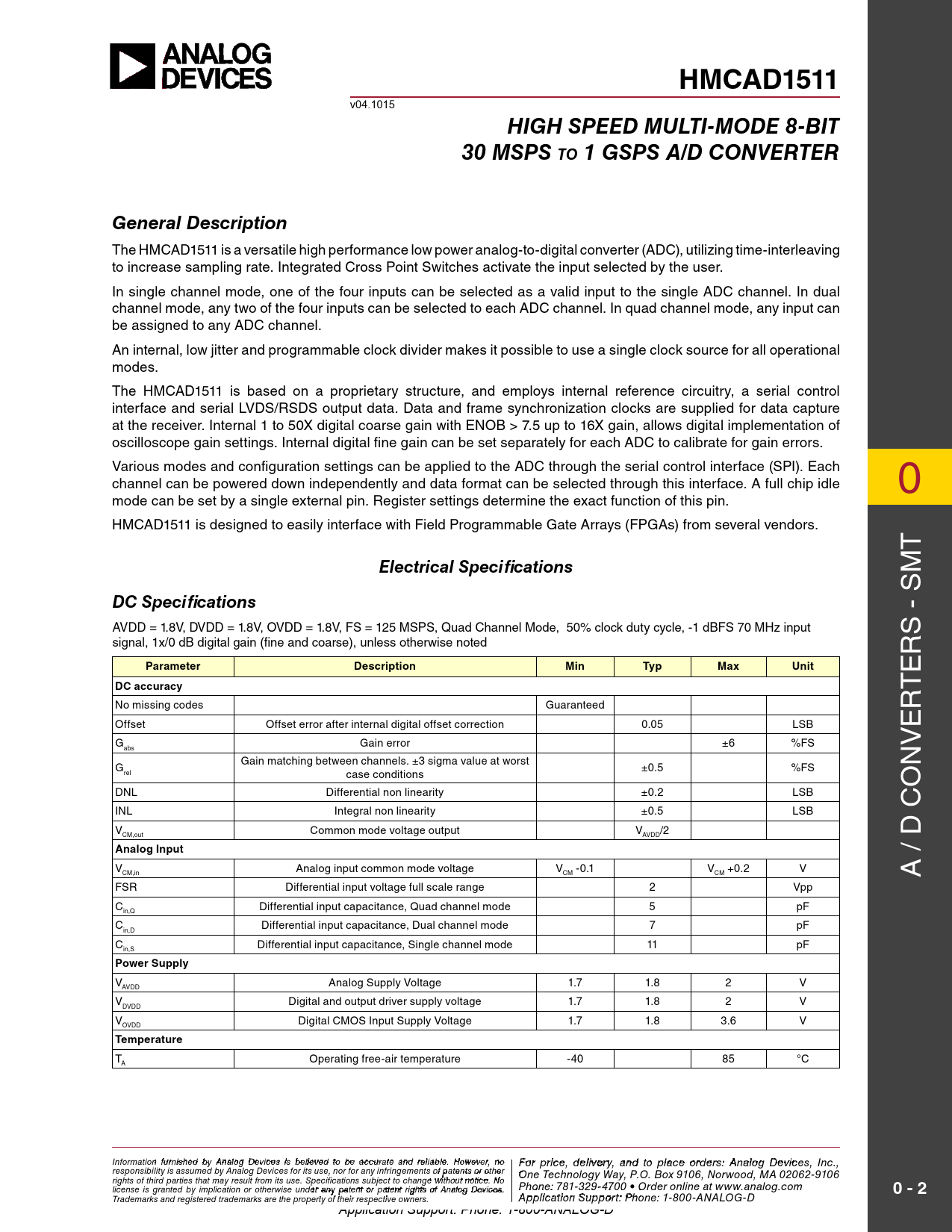 HMCAD1511. HigH Speed Multi-Mode 8-Bit. 30 MSpS to 1 gSpS A/d Converter. general description. electrical Specifications
