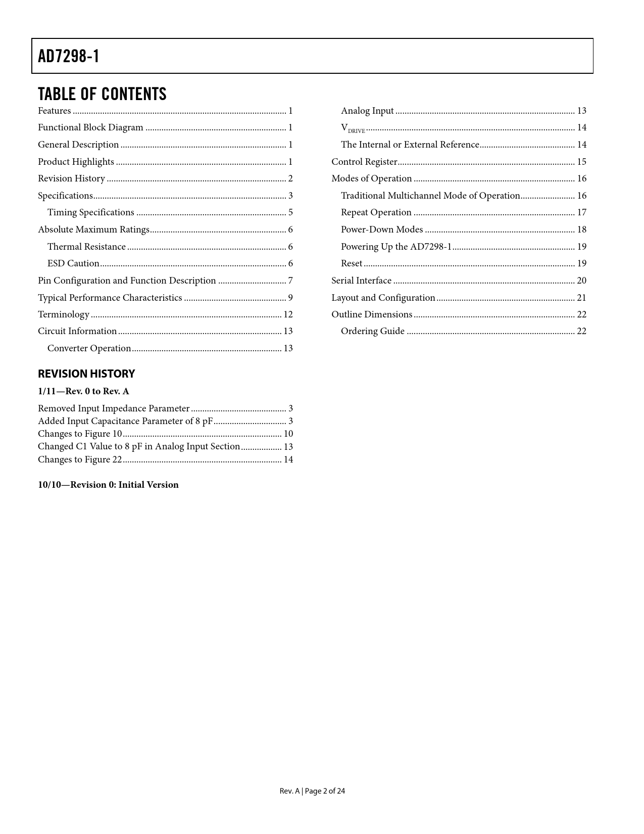 link to page 1 link to page 1 link to page 1 link to page 1 link to page 3 link to page 4 link to page 6 link to page 7 link to page 7 link to page 7 link to page 8 link to page 10 link to page 13 link to page 14 link to page 14 link to page 14 link to page 15 link to page 15 link to page 16 link to page 17 link to page 17 link to page 18 link to page 19 link to page 20 link to page 20 link to page 21 link to page 22 link to page 23 link to page 23 AD7298-1TABLE OF CONTENTS Features .. 1 Analog Input ... 13 Functional Block Diagram .. 1 VDRIVE .. 14 General Description ... 1 The Internal or External Reference .. 14 Product Highlights ... 1 Control Register .. 15 Revision History ... 2 Modes of Operation ... 16 Specifications ... 3 Traditional Multichannel Mode of Operation .. 16 Timing Specifications .. 5 Repeat Operation ... 17 Absolute Maximum Ratings .. 6 Power-Down Modes .. 18 Thermal Resistance .. 6 Powering Up the AD7298-1 .. 19 ESD Caution .. 6 Reset ... 19 Pin Configuration and Function Description .. 7 Serial Interface .. 20 Typical Performance Characteristics ... 9 Layout and Configuration ... 21 Terminology .. 12 Outline Dimensions ... 22 Circuit Information .. 13 Ordering Guide .. 22 Converter Operation .. 13 REVISION HISTORY 1/11—Rev. 0 to Rev. A Removed Input Impedance Parameter .. 3 Added Input Capacitance Parameter of 8 pF .. 3 Changes to Figure 10 .. 10 Changed C1 Value to 8 pF in Analog Input Section .. 13 Changes to Figure 22 .. 14 10/10—Revision 0: Initial Version Rev. A | Page 2 of 24 Document Outline Features Functional Block Diagram General Description Product Highlights Revision History Specifications Timing Specifications Absolute Maximum Ratings Thermal Resistance ESD Caution Pin Configuration and Function Description Typical Performance Characteristics Terminology Circuit Information Converter Operation Analog Input ADC Transfer Function VDRIVE The Internal or External Reference Control Register Modes of Operation Traditional Multichannel Mode of Operation Repeat Operation Power-Down Modes Normal Mode Partial Power-Down Mode Full Power-Down Mode Powering Up the AD7298-1 Reset Serial Interface Layout and Configuration Outline Dimensions Ordering Guide
