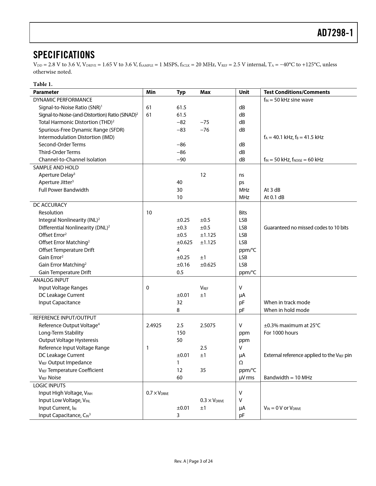 AD7298-1. SPECIFICATIONS. Table 1. Parameter Min. Typ. Max. Unit. Test. Conditions/Comments