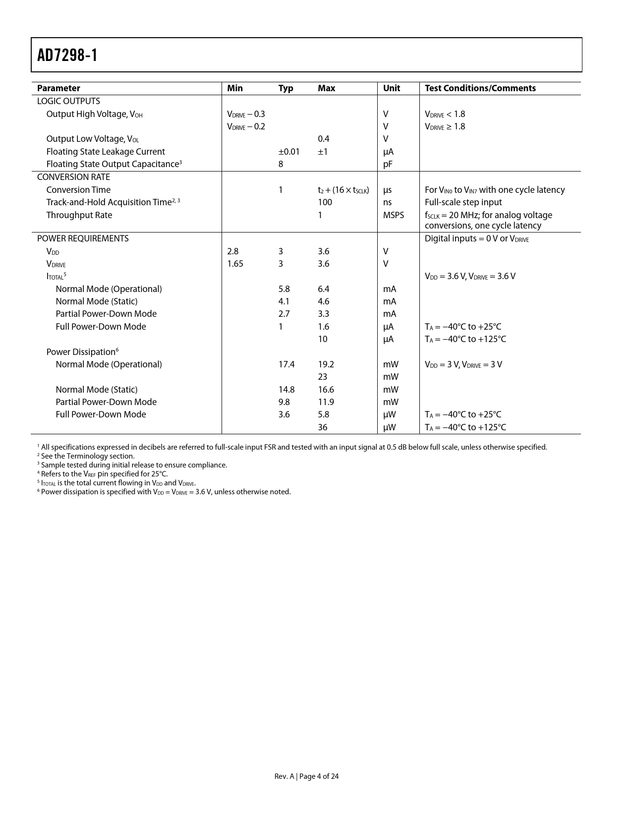 AD7298-1. Parameter Min. Typ. Max. Unit. Test. Conditions/Comments