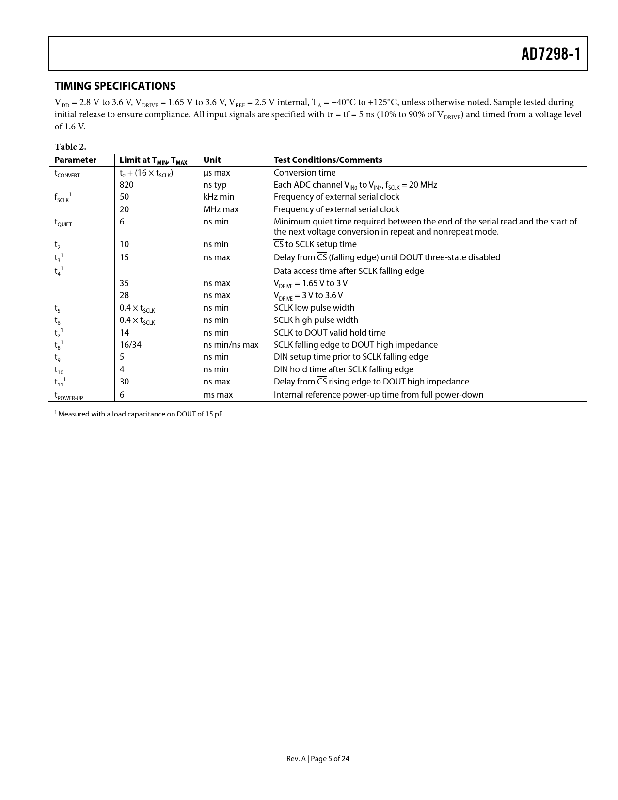 link to page 6 link to page 6 link to page 6 link to page 6 AD7298-1TIMING SPECIFICATIONS VDD = 2.8 V to 3.6 V, VDRIVE = 1.65 V to 3.6 V, VREF = 2.5 V internal, TA = −40°C to +125°C, unless otherwise noted. Sample tested during initial release to ensure compliance. All input signals are specified with tr = tf = 5 ns (10% to 90% of VDRIVE) and timed from a voltage level of 1.6 V. Table 2. ParameterLimit at T , TUnitTest Conditions/CommentsMINMAX t t + (16 × t ) µs max Conversion time CONVERT 2 SCLK 820 ns typ Each ADC channel V to V , f = 20 MHz IN0 IN7 SCLK f 1 50 kHz min Frequency of external serial clock SCLK 20 MHz max Frequency of external serial clock t 6 ns min Minimum quiet time required between the end of the serial read and the start of QUIET the next voltage conversion in repeat and nonrepeat mode. t 10 ns min 2 CS to SCLK setup time t 1 15 ns max Delay from 3 CS (falling edge) until DOUT three-state disabled t 1 Data access time after SCLK falling edge 4 35 ns max V = 1.65 V to 3 V DRIVE 28 ns max V = 3 V to 3.6 V DRIVE t 0.4 × t ns min SCLK low pulse width 5 SCLK t 0.4 × t ns min SCLK high pulse width 6 SCLK t 1 14 ns min SCLK to DOUT valid hold time 7 t 1 16/34 ns min/ns max SCLK falling edge to DOUT high impedance 8 t 5 ns min DIN setup time prior to SCLK falling edge 9 t 4 ns min DIN hold time after SCLK falling edge 10 t 1 30 ns max Delay from 11 CS rising edge to DOUT high impedance t 6 ms max Internal reference power-up time from full power-down POWER-UP 1 Measured with a load capacitance on DOUT of 15 pF. Rev. A | Page 5 of 24 Document Outline Features Functional Block Diagram General Description Product Highlights Revision History Specifications Timing Specifications Absolute Maximum Ratings Thermal Resistance ESD Caution Pin Configuration and Function Description Typical Performance Characteristics Terminology Circuit Information Converter Operation Analog Input ADC Transfer Function VDRIVE The Internal or External Reference Control Register Modes of Operation Traditional Multichannel Mode of Operation Repeat Operation Power-Down Modes Normal Mode Partial Power-Down Mode Full Power-Down Mode Powering Up the AD7298-1 Reset Serial Interface Layout and Configuration Outline Dimensions Ordering Guide