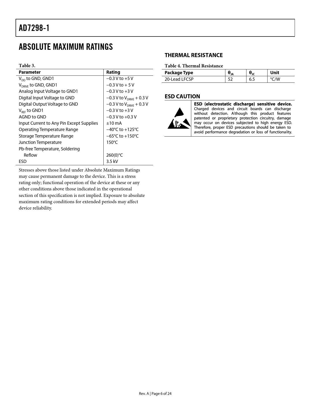 AD7298-1ABSOLUTE MAXIMUM RATINGSTHERMAL RESISTANCETable 3.Table 4. Thermal ResistanceParameterRatingPackage TypeθθUnitJAJC V to GND, GND1 −0.3 V to +5 V DD 20-Lead LFCSP 52 6.5 °C/W V to GND, GND1 −0.3 V to + 5 V DRIVE Analog Input Voltage to GND1 −0.3 V to +3 V Digital Input Voltage to GND −0.3 V to V + 0.3 V ESD CAUTION DRIVE Digital Output Voltage to GND −0.3 V to V + 0.3 V DRIVE V to GND1 −0.3 V to +3 V REF AGND to GND −0.3 V to +0.3 V Input Current to Any Pin Except Supplies ±10 mA Operating Temperature Range −40°C to +125°C Storage Temperature Range −65°C to +150°C Junction Temperature 150°C Pb-free Temperature, Soldering Reflow 260(0)°C ESD 3.5 kV Stresses above those listed under Absolute Maximum Ratings may cause permanent damage to the device. This is a stress rating only; functional operation of the device at these or any other conditions above those indicated in the operational section of this specification is not implied. Exposure to absolute maximum rating conditions for extended periods may affect device reliability. Rev. A | Page 6 of 24 Document Outline Features Functional Block Diagram General Description Product Highlights Revision History Specifications Timing Specifications Absolute Maximum Ratings Thermal Resistance ESD Caution Pin Configuration and Function Description Typical Performance Characteristics Terminology Circuit Information Converter Operation Analog Input ADC Transfer Function VDRIVE The Internal or External Reference Control Register Modes of Operation Traditional Multichannel Mode of Operation Repeat Operation Power-Down Modes Normal Mode Partial Power-Down Mode Full Power-Down Mode Powering Up the AD7298-1 Reset Serial Interface Layout and Configuration Outline Dimensions Ordering Guide