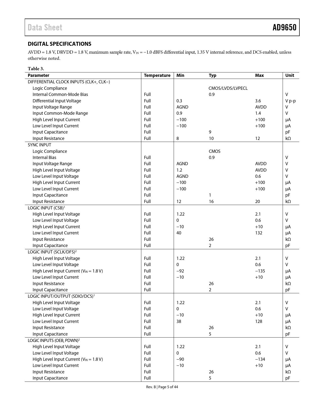 Data Sheet. AD9650. DIGITAL SPECIFICATIONS. Table 3. Parameter. Temperature Min. Typ. Max. Unit
