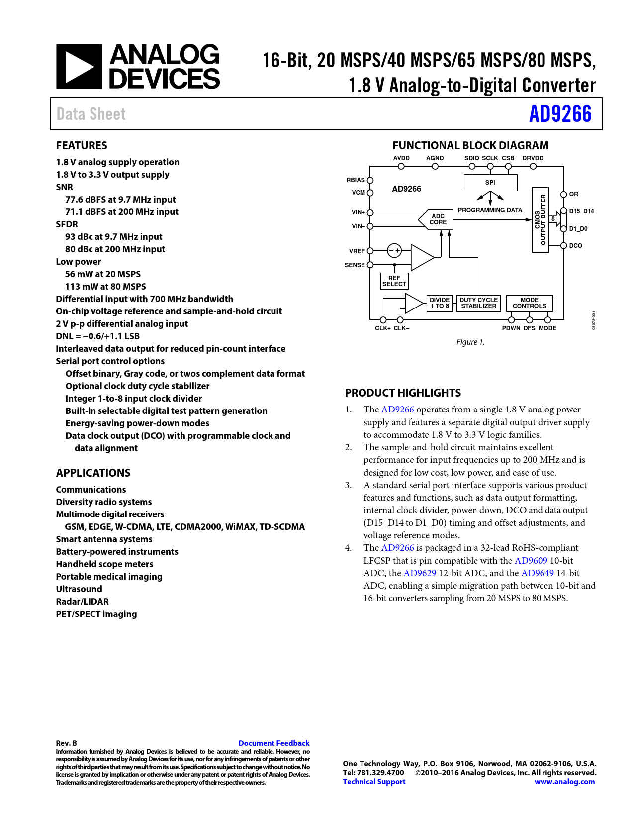 16-Bit, 20 MSPS/40 MSPS/65 MSPS/80 MSPS,. 1.8 V Analog-to-Digital Converter. Data Sheet. AD9266. FEATURES
