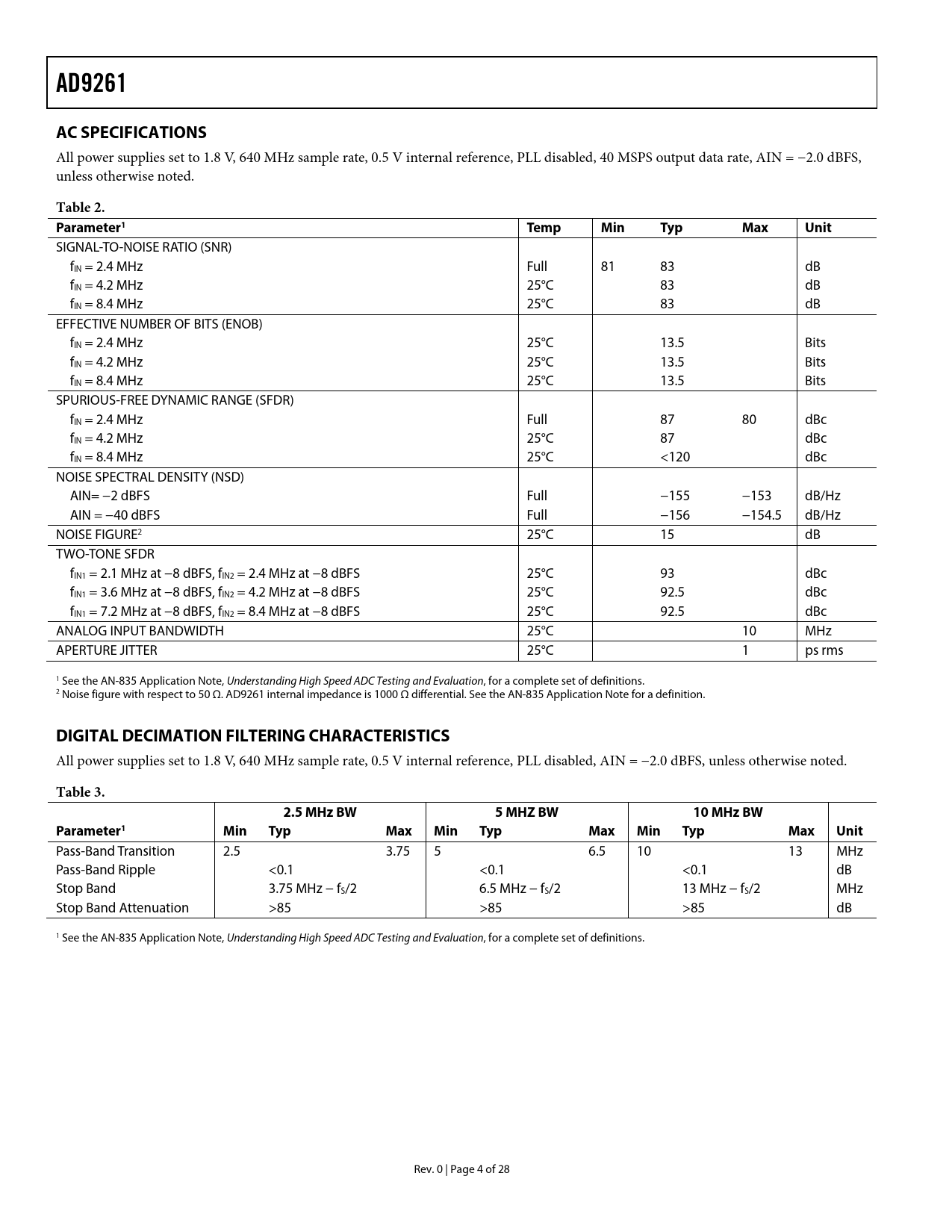 link to page 5 link to page 5 link to page 5 AD9261AC SPECIFICATIONS All power supplies set to 1.8 V, 640 MHz sample rate, 0.5 V internal reference, PLL disabled, 40 MSPS output data rate, AIN = −2.0 dBFS, unless otherwise noted. Table 2. Parameter1Temp Min TypMax Unit SIGNAL-TO-NOISE RATIO (SNR) fIN = 2.4 MHz Full 81 83 dB fIN = 4.2 MHz 25°C 83 dB fIN = 8.4 MHz 25°C 83 dB EFFECTIVE NUMBER OF BITS (ENOB) fIN = 2.4 MHz 25°C 13.5 Bits fIN = 4.2 MHz 25°C 13.5 Bits fIN = 8.4 MHz 25°C 13.5 Bits SPURIOUS-FREE DYNAMIC RANGE (SFDR) fIN = 2.4 MHz Full 87 80 dBc fIN = 4.2 MHz 25°C 87 dBc fIN = 8.4 MHz 25°C <120 dBc NOISE SPECTRAL DENSITY (NSD) AIN= −2 dBFS Full −155 −153 dB/Hz AIN = −40 dBFS Full −156 −154.5 dB/Hz NOISE FIGURE2 25°C 15 dB TWO-TONE SFDR fIN1 = 2.1 MHz at −8 dBFS, fIN2 = 2.4 MHz at −8 dBFS 25°C 93 dBc fIN1 = 3.6 MHz at −8 dBFS, fIN2 = 4.2 MHz at −8 dBFS 25°C 92.5 dBc fIN1 = 7.2 MHz at −8 dBFS, fIN2 = 8.4 MHz at −8 dBFS 25°C 92.5 dBc ANALOG INPUT BANDWIDTH 25°C 10 MHz APERTURE JITTER 25°C 1 ps rms 1 See the AN-835 Application Note, Understanding High Speed ADC Testing and Evaluation, for a complete set of definitions. 2 Noise figure with respect to 50 Ω. AD9261 internal impedance is 1000 Ω differential. See the AN-835 Application Note for a definition. DIGITAL DECIMATION FILTERING CHARACTERISTICS All power supplies set to 1.8 V, 640 MHz sample rate, 0.5 V internal reference, PLL disabled, AIN = −2.0 dBFS, unless otherwise noted. Table 3.2.5 MHz BW5 MHZ BW10 MHz BWParameter1MinTypMaxMinTypMaxMin TypMax Unit Pass-Band Transition 2.5 3.75 5 6.5 10 13 MHz Pass-Band Ripple <0.1 <0.1 <0.1 dB Stop Band 3.75 MHz − fS/2 6.5 MHz − fS/2 13 MHz − fS/2 MHz Stop Band Attenuation >85 >85 >85 dB 1 See the AN-835 Application Note, Understanding High Speed ADC Testing and Evaluation, for a complete set of definitions. Rev. 0 | Page 4 of 28 Document Outline Features Applications Functional Block Diagram General Description Product Highlights Revision History Specifications DC Specifications AC Specifications Digital Decimation Filtering Characteristics Digital Specifications Switching Specifications Timing Diagram Absolute Maximum Ratings Thermal Resistance ESD Caution Pin Configuration and Function Descriptions Typical Performance Characteristics Equivalent Circuits Theory of Operation Analog Input Considerations Input Common Mode Differential Input Configurations Voltage Reference Internal Reference Connection External Reference Operation Clock Input Considerations Direct Clocking Internal PLL Clock Distribution External PLL Control PLL Autoband Select Jitter Considerations Power Dissipation and Standby Mode Digital Engine Bandwidth Selection Decimation Filters Sample Rate Converter Cascaded Filter Responses Digital Outputs Digital Output Format Overrange (OR) Condition Timing Serial Port Interface (SPI) Configuration Using the SPI Hardware Interface Memory Map Memory Map Definitions Outline Dimensions Ordering Guide