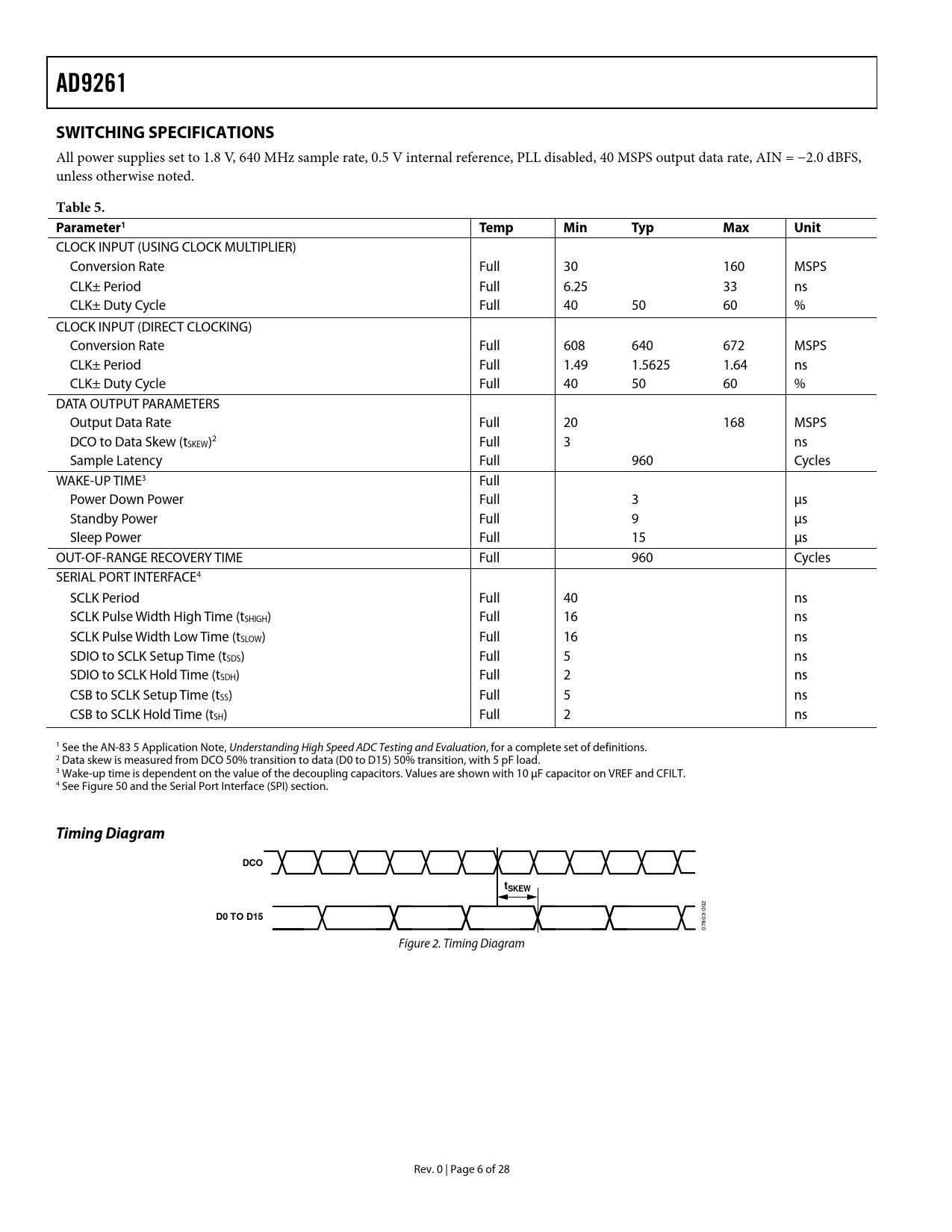 AD9261 SWITCHING SPECIFICATIONS Table 5 Parameter1 T emp Min Typ Max Unit Timing Diagram DCO tSKEW D0 TO D15
