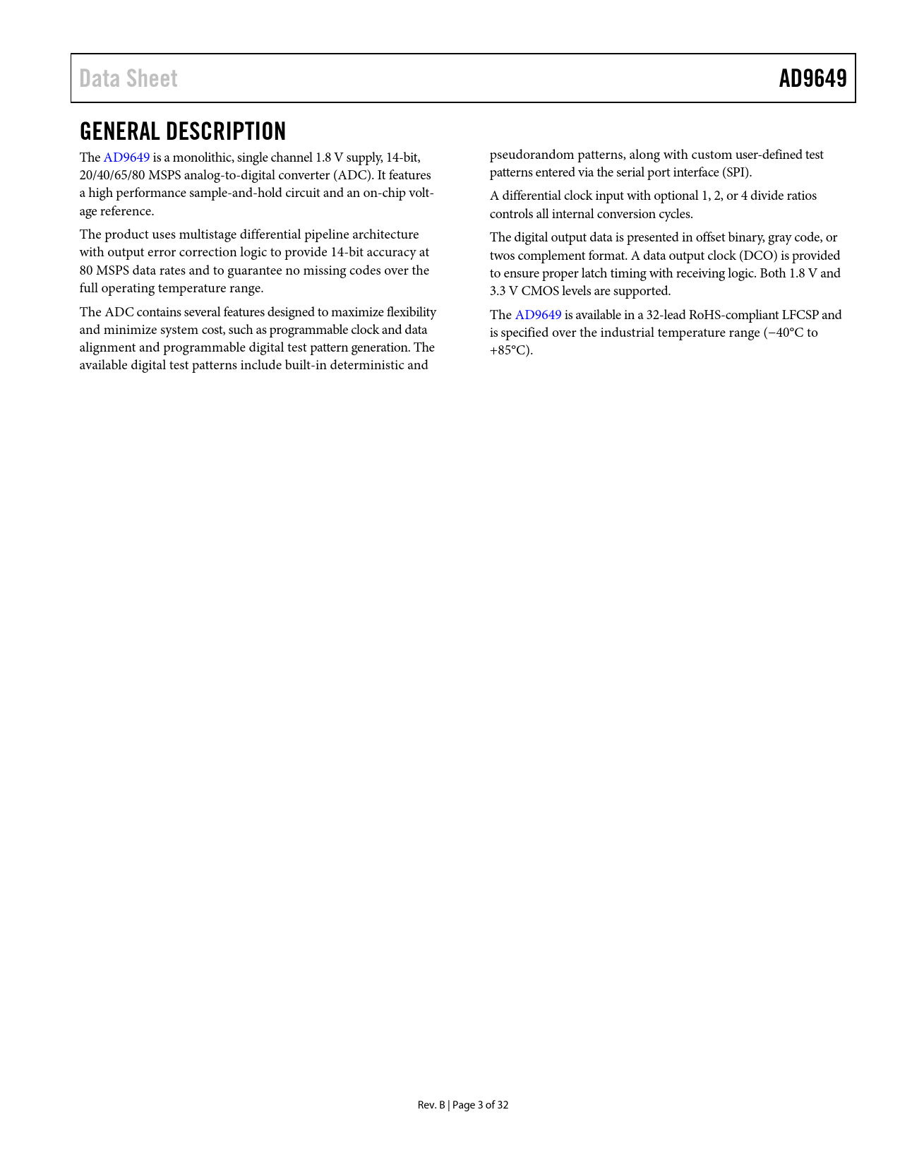 Data SheetAD9649GENERAL DESCRIPTION The AD9649 is a monolithic, single channel 1.8 V supply, 14-bit, pseudorandom patterns, along with custom user-defined test 20/40/65/80 MSPS analog-to-digital converter (ADC). It features patterns entered via the serial port interface (SPI). a high performance sample-and-hold circuit and an on-chip volt- A differential clock input with optional 1, 2, or 4 divide ratios age reference. controls al internal conversion cycles. The product uses multistage differential pipeline architecture The digital output data is presented in offset binary, gray code, or with output error correction logic to provide 14-bit accuracy at twos complement format. A data output clock (DCO) is provided 80 MSPS data rates and to guarantee no missing codes over the to ensure proper latch timing with receiving logic. Both 1.8 V and full operating temperature range. 3.3 V CMOS levels are supported. The ADC contains several features designed to maximize flexibility The AD9649 is available in a 32-lead RoHS-compliant LFCSP and and minimize system cost, such as programmable clock and data is specified over the industrial temperature range (−40°C to alignment and programmable digital test pattern generation. The +85°C). available digital test patterns include built-in deterministic and Rev. B | Page 3 of 32 Document Outline FEATURES APPLICATIONS FUNCTIONAL BLOCK DIAGRAM PRODUCT HIGHLIGHTS REVISION HISTORY GENERAL DESCRIPTION SPECIFICATIONS DC SPECIFICATIONS AC SPECIFICATIONS DIGITAL SPECIFICATIONS SWITCHING SPECIFICATIONS TIMING SPECIFICATIONS ABSOLUTE MAXIMUM RATINGS THERMAL CHARACTERISTICS ESD CAUTION PIN CONFIGURATION AND FUNCTION DESCRIPTIONS TYPICAL PERFORMANCE CHARACTERISTICS AD9649-80 AD9649-65 AD9649-40 AD9649-20 EQUIVALENT CIRCUITS THEORY OF OPERATION ANALOG INPUT CONSIDERATIONS Input Common Mode Differential Input Configurations Single-Ended Input Configuration VOLTAGE REFERENCE Internal Reference Connection External Reference Operation CLOCK INPUT CONSIDERATIONS Clock Input Options Input Clock Divider Clock Duty Cycle Jitter Considerations POWER DISSIPATION AND STANDBY MODE DIGITAL OUTPUTS Digital Output Enable Function (OEB) TIMING Data Clock Output (DCO) BUILT-IN SELF-TEST (BIST) AND OUTPUT TEST BUILT-IN SELF-TEST (BIST) OUTPUT TEST MODES SERIAL PORT INTERFACE (SPI) CONFIGURATION USING THE SPI HARDWARE INTERFACE CONFIGURATION WITHOUT THE SPI SPI ACCESSIBLE FEATURES MEMORY MAP READING THE MEMORY MAP REGISTER TABLE OPEN LOCATIONS DEFAULT VALUES Logic Levels Transfer Register Map MEMORY MAP REGISTER TABLE MEMORY MAP REGISTER DESCRIPTIONS USR2 (Register 0x101) Bit 3—Enable GCLK Detect Bit 2—Run GCLK Bit 0—Disable SDIO Pull-Down APPLICATIONS INFORMATION DESIGN GUIDELINES Power and Ground Recommendations Exposed Paddle Thermal Heat Sink Recommendations Encode Clock VCM RBIAS Reference Decoupling SPI Port Soft Reset OUTLINE DIMENSIONS ORDERING GUIDE