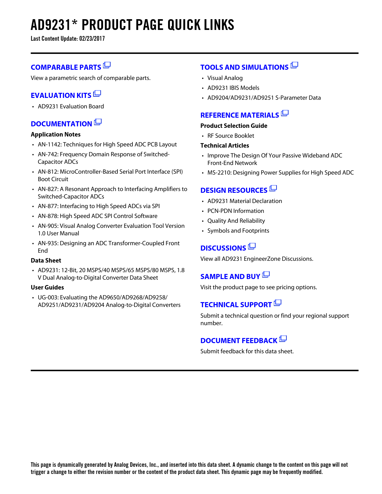 AD9231* PRODUCT PAGE QUICK LINKS Last Content Update: 02/23/2017COMPARABLE PARTSTOOLS AND SIMULATIONS View a parametric search of comparable parts. • Visual Analog • AD9231 IBIS Models EVALUATION KITS • AD9204/AD9231/AD9251 S-Parameter Data • AD9231 Evaluation Board REFERENCE MATERIALSDOCUMENTATIONProduct Selection GuideApplication Notes • RF Source Booklet • AN-1142: Techniques for High Speed ADC PCB Layout Technical Articles • AN-742: Frequency Domain Response of Switched- • Improve The Design Of Your Passive Wideband ADC Capacitor ADCs Front-End Network • AN-812: MicroController-Based Serial Port Interface (SPI) • MS-2210: Designing Power Supplies for High Speed ADC Boot Circuit • AN-827: A Resonant Approach to Interfacing Amplifiers to DESIGN RESOURCES Switched-Capacitor ADCs • AD9231 Material Declaration • AN-877: Interfacing to High Speed ADCs via SPI • PCN-PDN Information • AN-878: High Speed ADC SPI Control Software • Quality And Reliability • AN-905: Visual Analog Converter Evaluation Tool Version 1.0 User Manual • Symbols and Footprints • AN-935: Designing an ADC Transformer-Coupled Front End DISCUSSIONSData Sheet View all AD9231 EngineerZone Discussions. • AD9231: 12-Bit, 20 MSPS/40 MSPS/65 MSPS/80 MSPS, 1.8 V Dual Analog-to-Digital Converter Data Sheet SAMPLE AND BUYUser Guides Visit the product page to see pricing options. • UG-003: Evaluating the AD9650/AD9268/AD9258/ AD9251/AD9231/AD9204 Analog-to-Digital Converters TECHNICAL SUPPORT Submit a technical question or find your regional support number. DOCUMENT FEEDBACK Submit feedback for this data sheet. This page is dynamically generated by Analog Devices, Inc., and inserted into this data sheet. A dynamic change to the content on this page will not trigger a change to either the revision number or the content of the product data sheet. This dynamic page may be frequently modified. Document Outline FEATURES APPLICATIONS FUNCTIONAL BLOCK DIAGRAM PRODUCT HIGHLIGHTS REVISION HISTORY GENERAL DESCRIPTION SPECIFICATIONS DC SPECIFICATIONS AC SPECIFICATIONS DIGITAL SPECIFICATIONS SWITCHING SPECIFICATIONS TIMING SPECIFICATIONS ABSOLUTE MAXIMUM RATINGS THERMAL CHARACTERISTICS ESD CAUTION PIN CONFIGURATION AND FUNCTION DESCRIPTIONS TYPICAL PERFORMANCE CHARACTERISTICS AD9231-80 AD9231-65 AD9231-40 AD9231-20 EQUIVALENT CIRCUITS THEORY OF OPERATION ADC ARCHITECTURE ANALOG INPUT CONSIDERATIONS Input Common Mode Differential Input Configurations Single-Ended Input Configuration VOLTAGE REFERENCE Internal Reference Connection External Reference Operation CLOCK INPUT CONSIDERATIONS Clock Input Options Input Clock Divider Clock Duty Cycle Jitter Considerations CHANNEL/CHIP SYNCHRONIZATION POWER DISSIPATION AND STANDBY MODE DIGITAL OUTPUTS Digital Output Enable Function (OEB) TIMING Data Clock Output (DCO) BUILT-IN SELF-TEST (BIST) AND OUTPUT TEST BUILT-IN SELF-TEST (BIST) OUTPUT TEST MODES SERIAL PORT INTERFACE (SPI) CONFIGURATION USING THE SPI HARDWARE INTERFACE CONFIGURATION WITHOUT THE SPI SPI ACCESSIBLE FEATURES MEMORY MAP READING THE MEMORY MAP REGISTER TABLE OPEN LOCATIONS DEFAULT VALUES Logic Levels Transfer Register Map Channel-Specific Registers MEMORY MAP REGISTER TABLE MEMORY MAP REGISTER DESCRIPTIONS Sync Control (Register 0x100) Bits[7:3]—Reserved Bit 2—Clock Divider Next Sync Only Bit 1—Clock Divider Sync Enable Bit 0—Master Sync Enable Bit 7—Enable OEB Pin 47 Bit 3—Enable GCLK Detect Bit 2—Run GCLK Bit 0—Disable SDIO Pull-Down APPLICATIONS INFORMATION DESIGN GUIDELINES Power and Ground Recommendations Exposed Paddle Thermal Heat Sink Recommendations VCM RBIAS Reference Decoupling SPI Port OUTLINE DIMENSIONS ORDERING GUIDE