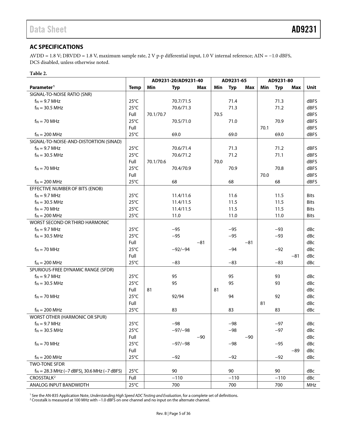 Data Sheet. AD9231. AC SPECIFICATIONS. Table 2. AD9231-20/AD9231-40. AD9231-65. AD9231-80. Parameter1. Temp Min. Typ. Max. Min Typ. Max Min Typ