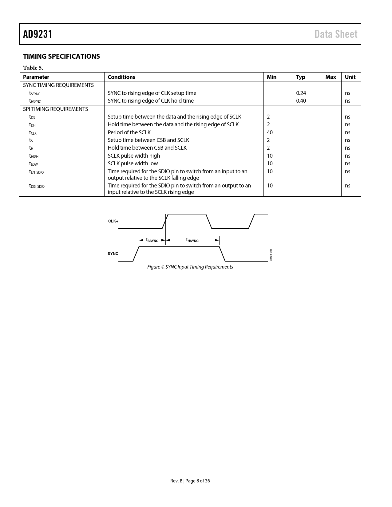 AD9231. Data Sheet. TIMING SPECIFICATIONS Table 5. Parameter. Conditions. Min. Typ. Max. Unit. CLK+. SSYNC. HSYNC. SYNC