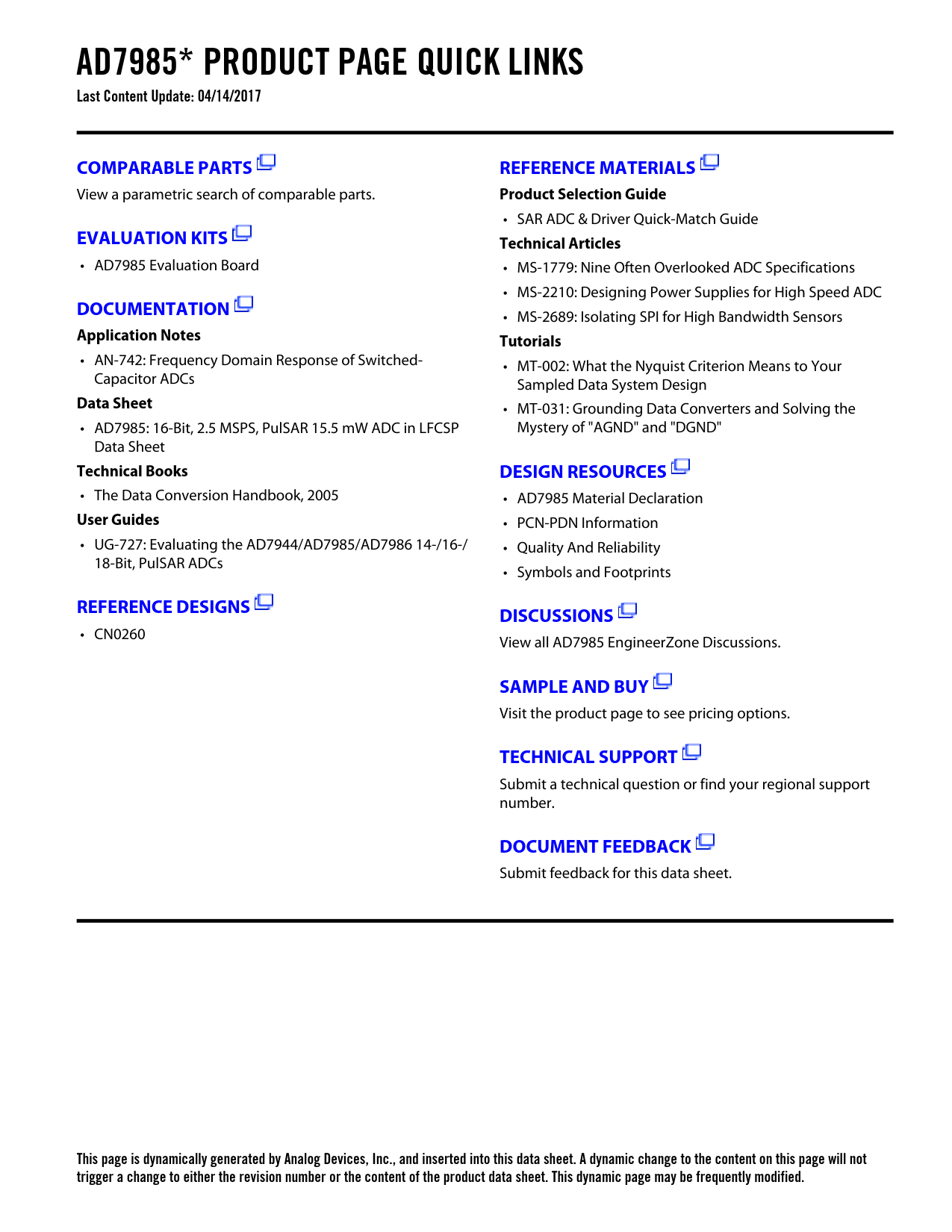 AD7985* PRODUCT PAGE QUICK LINKS Last Content Update: 04/14/2017. COMPARABLE PARTS. REFERENCE MATERIALS