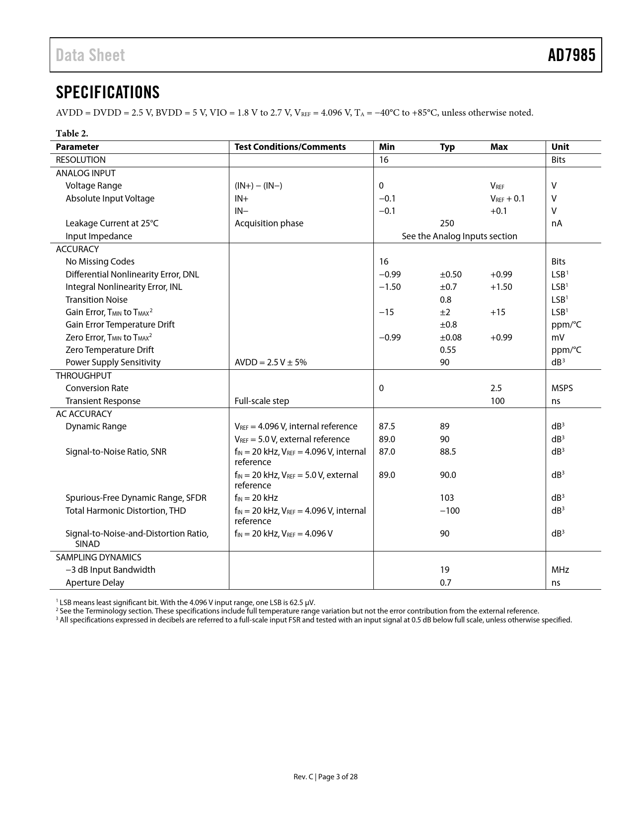link to page 16 link to page 13 Data SheetAD7985SPECIFICATIONS AVDD = DVDD = 2.5 V, BVDD = 5 V, VIO = 1.8 V to 2.7 V, VREF = 4.096 V, TA = −40°C to +85°C, unless otherwise noted. Table 2. ParameterTest Conditions/CommentsMinTypMaxUnit RESOLUTION 16 Bits ANALOG INPUT Voltage Range (IN+) − (IN−) 0 VREF V Absolute Input Voltage IN+ −0.1 VREF + 0.1 V IN− −0.1 +0.1 V Leakage Current at 25°C Acquisition phase 250 nA Input Impedance See the Analog Inputs section ACCURACY No Missing Codes 16 Bits Differential Nonlinearity Error, DNL −0.99 ±0.50 +0.99 LSB1 Integral Nonlinearity Error, INL −1.50 ±0.7 +1.50 LSB1 Transition Noise 0.8 LSB1 Gain Error, T 2 MIN to TMAX −15 ±2 +15 LSB1 Gain Error Temperature Drift ±0.8 ppm/°C Zero Error, T 2 MIN to TMAX −0.99 ±0.08 +0.99 mV Zero Temperature Drift 0.55 ppm/°C Power Supply Sensitivity AVDD = 2.5 V ± 5% 90 dB3 THROUGHPUT Conversion Rate 0 2.5 MSPS Transient Response Full-scale step 100 ns AC ACCURACY Dynamic Range VREF = 4.096 V, internal reference 87.5 89 dB3 VREF = 5.0 V, external reference 89.0 90 dB3 Signal-to-Noise Ratio, SNR fIN = 20 kHz, VREF = 4.096 V, internal 87.0 88.5 dB3 reference fIN = 20 kHz, VREF = 5.0 V, external 89.0 90.0 dB3 reference Spurious-Free Dynamic Range, SFDR fIN = 20 kHz 103 dB3 Total Harmonic Distortion, THD fIN = 20 kHz, VREF = 4.096 V, internal −100 dB3 reference Signal-to-Noise-and-Distortion Ratio, fIN = 20 kHz, VREF = 4.096 V 90 dB3 SINAD SAMPLING DYNAMICS −3 dB Input Bandwidth 19 MHz Aperture Delay 0.7 ns 1 LSB means least significant bit. With the 4.096 V input range, one LSB is 62.5 µV. 2 See the Terminology section. These specifications include full temperature range variation but not the error contribution from the external reference. 3 All specifications expressed in decibels are referred to a full-scale input FSR and tested with an input signal at 0.5 dB below ful scale, unless otherwise specified. Rev. C | Page 3 of 28 Document Outline FEATURES APPLICATIONS APPLICATION DIAGRAM GENERAL DESCRIPTION REVISION HISTORY SPECIFICATIONS TIMING SPECIFICATIONS ABSOLUTE MAXIMUM RATINGS ESD CAUTION PIN CONFIGURATION AND FUNCTION DESCRIPTIONS TYPICAL PERFORMANCE CHARACTERISTICS TERMINOLOGY THEORY OF OPERATION CIRCUIT INFORMATION CONVERTER OPERATION CONVERSION MODES OF OPERATION Transfer Functions TYPICAL CONNECTION DIAGRAM ANALOG INPUTS DRIVER AMPLIFIER CHOICE VOLTAGE REFERENCE INPUT Internal Reference, REF = 4.096 V (PDREF Low) External 1.2 V Reference and Internal Buffer (PDREF High) External Reference (PDREF High, REFIN Low) Reference Decoupling POWER SUPPLY DIGITAL INTERFACE DATA READING OPTIONS Reading During Conversion, Fast Host (Turbo or Normal Mode) Split-Reading, Any Speed Host (Turbo or Normal Mode) Reading During Acquisition, Any Speed Host (Turbo or Normal Mode) /CS MODE, 3-WIRE WITHOUT BUSY INDICATOR /CS MODE, 3-WIRE WITH BUSY INDICATOR /CS MODE, 4-WIRE WITHOUT BUSY INDICATOR /CS MODE, 4-WIRE WITH BUSY INDICATOR CHAIN MODE WITHOUT BUSY INDICATOR CHAIN MODE WITH BUSY INDICATOR APPLICATIONS INFORMATION LAYOUT EVALUATING THE AD7985 PERFORMANCE OUTLINE DIMENSIONS ORDERING GUIDE
