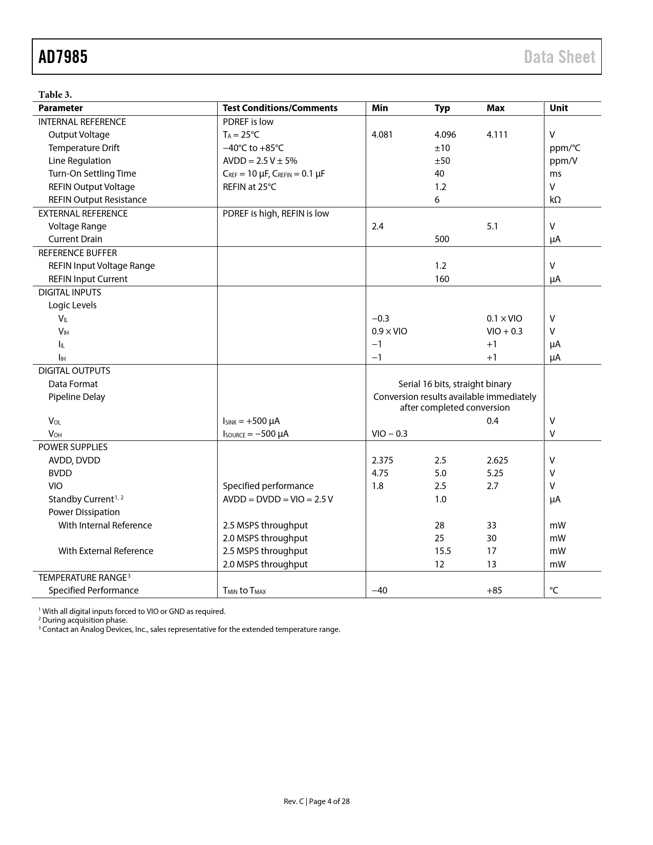 AD7985Data SheetTable 3. ParameterTest Conditions/CommentsMinTypMaxUnit INTERNAL REFERENCE PDREF is low Output Voltage TA = 25°C 4.081 4.096 4.111 V Temperature Drift −40°C to +85°C ±10 ppm/°C Line Regulation AVDD = 2.5 V ± 5% ±50 ppm/V Turn-On Settling Time CREF = 10 μF, CREFIN = 0.1 μF 40 ms REFIN Output Voltage REFIN at 25°C 1.2 V REFIN Output Resistance 6 kΩ EXTERNAL REFERENCE PDREF is high, REFIN is low Voltage Range 2.4 5.1 V Current Drain 500 µA REFERENCE BUFFER REFIN Input Voltage Range 1.2 V REFIN Input Current 160 µA DIGITAL INPUTS Logic Levels VIL −0.3 0.1 × VIO V VIH 0.9 × VIO VIO + 0.3 V IIL −1 +1 µA IIH −1 +1 µA DIGITAL OUTPUTS Data Format Serial 16 bits, straight binary Pipeline Delay Conversion results available immediately after completed conversion VOL ISINK = +500 µA 0.4 V VOH ISOURCE = −500 µA VIO − 0.3 V POWER SUPPLIES AVDD, DVDD 2.375 2.5 2.625 V BVDD 4.75 5.0 5.25 V VIO Specified performance 1.8 2.5 2.7 V Standby Current1, 2 AVDD = DVDD = VIO = 2.5 V 1.0 µA Power Dissipation With Internal Reference 2.5 MSPS throughput 28 33 mW 2.0 MSPS throughput 25 30 mW With External Reference 2.5 MSPS throughput 15.5 17 mW 2.0 MSPS throughput 12 13 mW TEMPERATURE RANGE3 Specified Performance TMIN to TMAX −40 +85 °C 1 With all digital inputs forced to VIO or GND as required. 2 During acquisition phase. 3 Contact an Analog Devices, Inc., sales representative for the extended temperature range. Rev. C | Page 4 of 28 Document Outline FEATURES APPLICATIONS APPLICATION DIAGRAM GENERAL DESCRIPTION REVISION HISTORY SPECIFICATIONS TIMING SPECIFICATIONS ABSOLUTE MAXIMUM RATINGS ESD CAUTION PIN CONFIGURATION AND FUNCTION DESCRIPTIONS TYPICAL PERFORMANCE CHARACTERISTICS TERMINOLOGY THEORY OF OPERATION CIRCUIT INFORMATION CONVERTER OPERATION CONVERSION MODES OF OPERATION Transfer Functions TYPICAL CONNECTION DIAGRAM ANALOG INPUTS DRIVER AMPLIFIER CHOICE VOLTAGE REFERENCE INPUT Internal Reference, REF = 4.096 V (PDREF Low) External 1.2 V Reference and Internal Buffer (PDREF High) External Reference (PDREF High, REFIN Low) Reference Decoupling POWER SUPPLY DIGITAL INTERFACE DATA READING OPTIONS Reading During Conversion, Fast Host (Turbo or Normal Mode) Split-Reading, Any Speed Host (Turbo or Normal Mode) Reading During Acquisition, Any Speed Host (Turbo or Normal Mode) /CS MODE, 3-WIRE WITHOUT BUSY INDICATOR /CS MODE, 3-WIRE WITH BUSY INDICATOR /CS MODE, 4-WIRE WITHOUT BUSY INDICATOR /CS MODE, 4-WIRE WITH BUSY INDICATOR CHAIN MODE WITHOUT BUSY INDICATOR CHAIN MODE WITH BUSY INDICATOR APPLICATIONS INFORMATION LAYOUT EVALUATING THE AD7985 PERFORMANCE OUTLINE DIMENSIONS ORDERING GUIDE