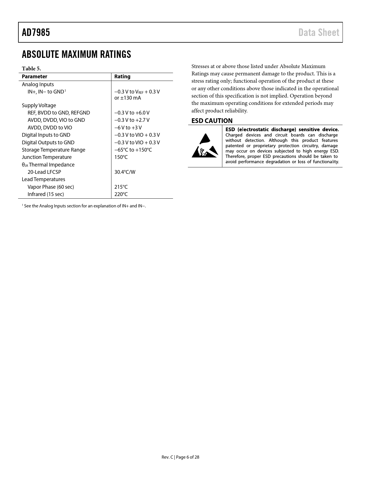 AD7985. Data Sheet. ABSOLUTE MAXIMUM RATINGS Table 5. Parameter. Rating. ESD CAUTION