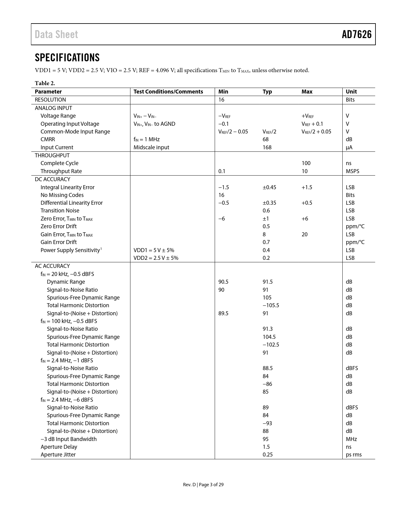 Data Sheet. AD7626. SPECIFICATIONS. Table 2. Parameter. Test Conditions/Comments. Min. Typ. Max. Unit