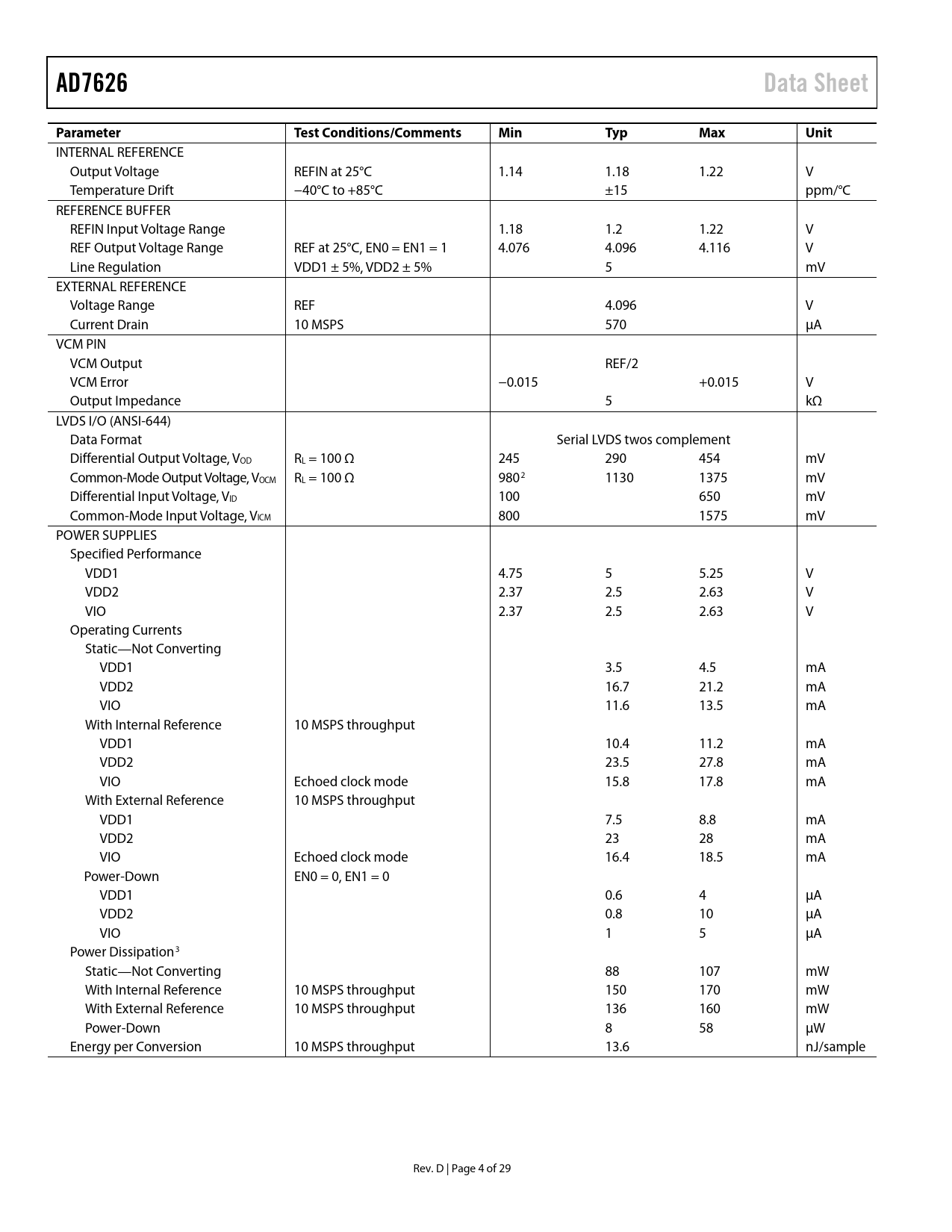 | Pages / Page | 30 / 5 — AD7626. Data Sheet. Parameter. Test Conditions/Comments. Min. Typ. Max. … |
