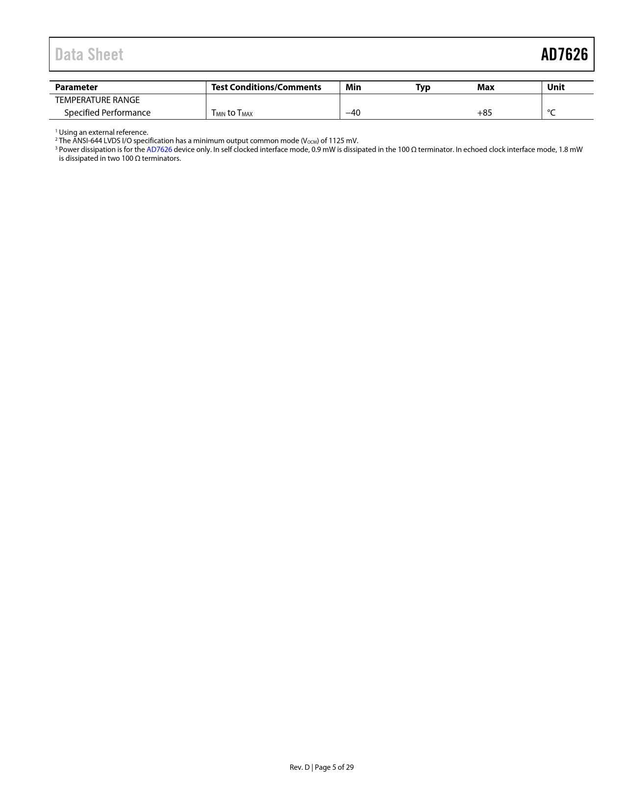 Data SheetAD7626ParameterTest Conditions/CommentsMinTypMaxUnit TEMPERATURE RANGE Specified Performance TMIN to TMAX −40 +85 °C 1 Using an external reference. 2 The ANSI-644 LVDS I/O specification has a minimum output common mode (VOCM) of 1125 mV. 3 Power dissipation is for the AD7626 device only. In self clocked interface mode, 0.9 mW is dissipated in the 100 Ω terminator. In echoed clock interface mode, 1.8 mW is dissipated in two 100 Ω terminators. Rev. D | Page 5 of 29 Document Outline FEATURES APPLICATIONS FUNCTIONAL BLOCK DIAGRAM GENERAL DESCRIPTION REVISION HISTORY SPECIFICATIONS TIMING SPECIFICATIONS TIMING DIAGRAMS ABSOLUTE MAXIMUM RATINGS THERMAL RESISTANCE ESD CAUTION PIN CONFIGURATION AND FUNCTION DESCRIPTIONS TYPICAL PERFORMANCE CHARACTERISTICS TERMINOLOGY THEORY OF OPERATION CIRCUIT INFORMATION CONVERTER INFORMATION TRANSFER FUNCTIONS ANALOG INPUTS TYPICAL CONNECTION DIAGRAM DRIVING THE AD7626 Differential Analog Input Source Single-Ended to Differential Driver Single-Ended or Fully Differential High Frequency Driver VOLTAGE REFERENCE OPTIONS Wake-Up Time from EN1 = 0, EN0 = 0 POWER SUPPLY Power-Up DIGITAL INTERFACE Conversion Control Echoed Clock Interface Mode Self Clocked Mode APPLICATIONS INFORMATION LAYOUT, DECOUPLING, AND GROUNDING Exposed Paddle VDD1 Supply Routing and Decoupling VIO Supply Decoupling Layout and Decoupling of Pin 25 to Pin 32 OUTLINE DIMENSIONS ORDERING GUIDE