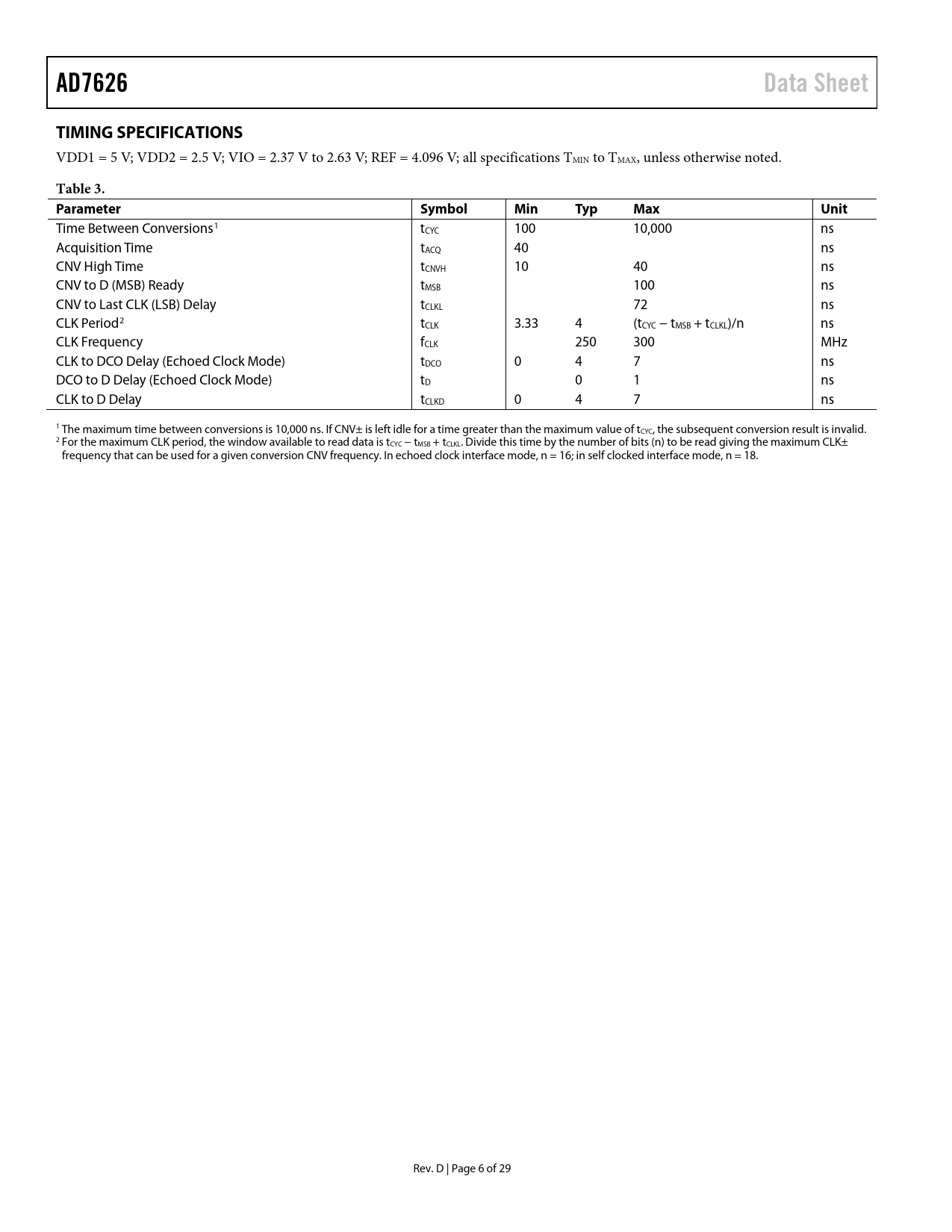 AD7626 Data Sheet TIMING SPECIFICATIONS Table 3 Parameter Symbol Min Typ Max Unit