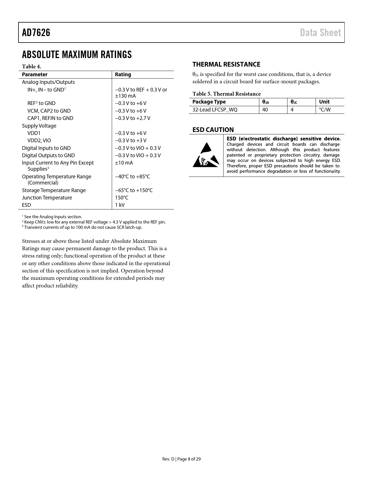 AD7626 Data Sheet ABSOLUTE MAXIMUM RATINGS Table 4 THERMAL RESISTANCE Parameter Rating Table 5 Thermal Resistance