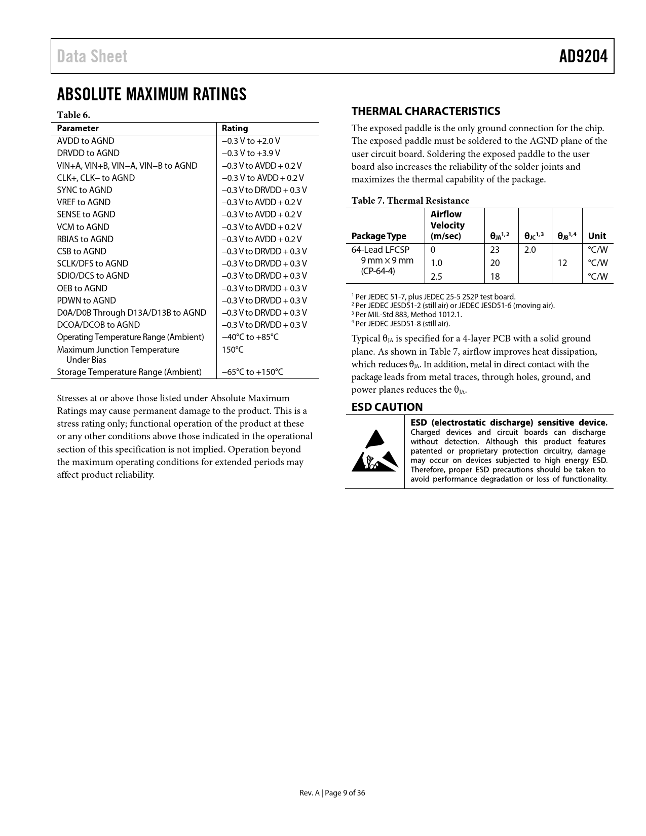 Data Sheet AD9204 ABSOLUTE MAXIMUM RATINGS Table 6 THERMAL CHARACTERISTICS Parameter Rating Table 7 Thermal Resistance