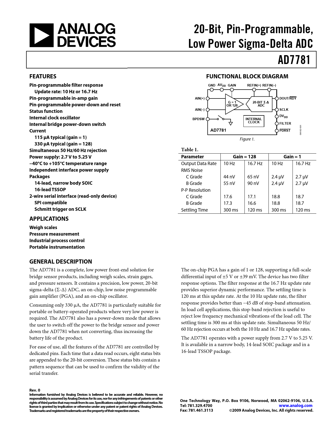 | Pages / Page | 17 / 1 — 20-Bit, Pin-Programmable,. Low Power Sigma-Delta ADC. AD7781. FEATURES. … |