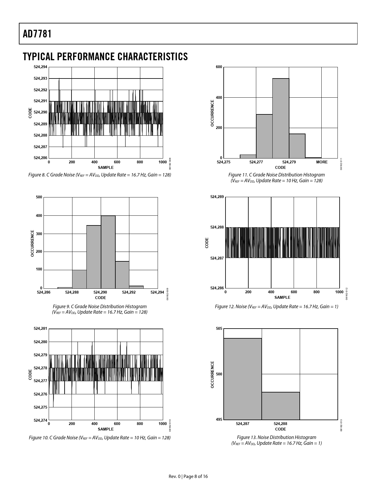 16 08 08 Figure 9. C Grade Noise Distribution Histogram Figure 12. Noise (VREF = AVDD, Update Rate = 16.7 Hz, Gain = 1) (VREF = AVDD, Update Rate = 16.7 Hz, Gain = 128)