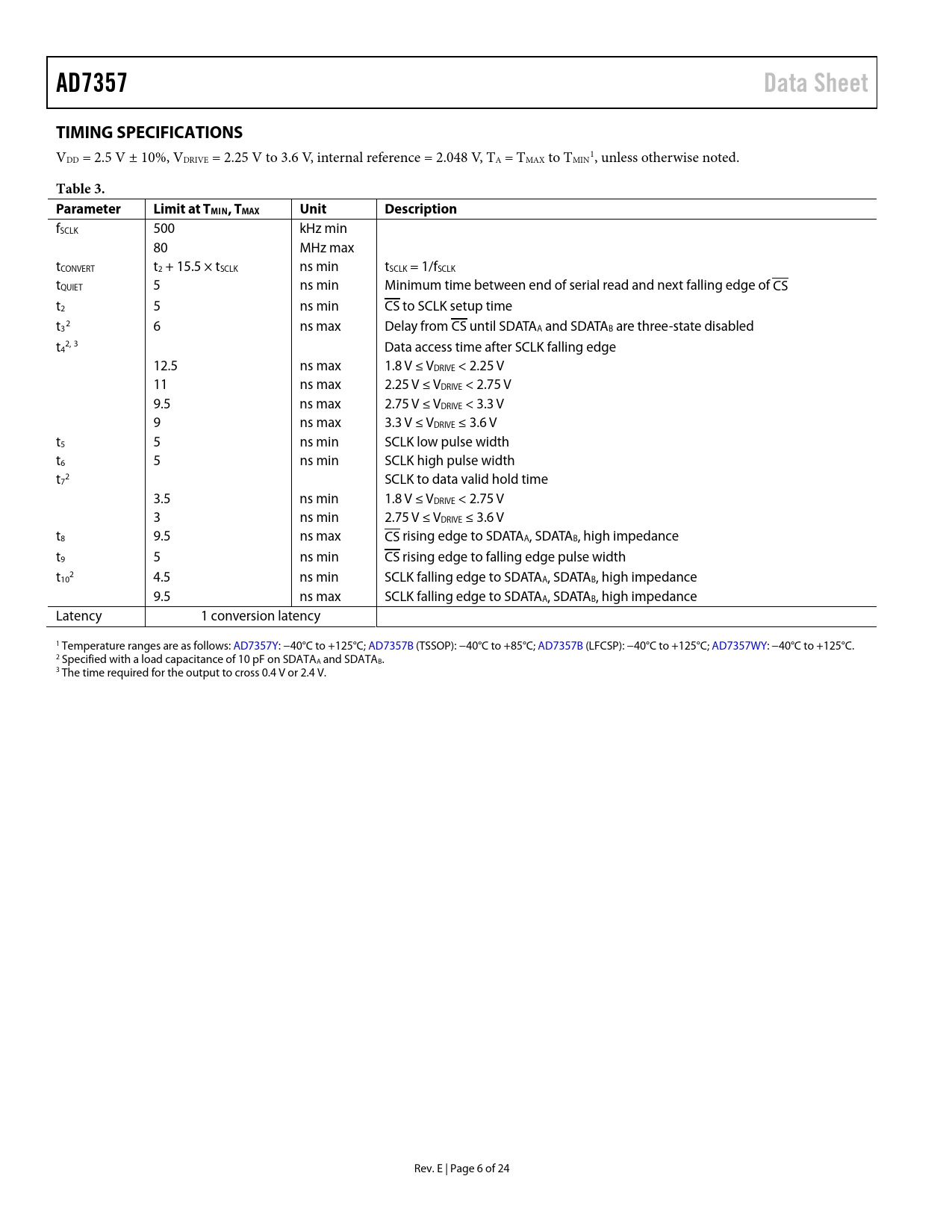 AD7357 Data Sheet TIMING SPECIFICATIONS Table 3 Parameter Limit at TMIN, TMAX Unit Description