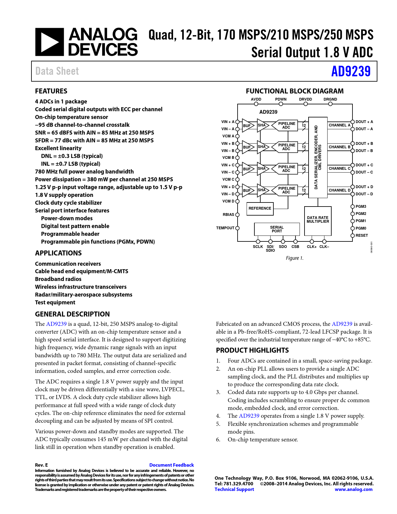 Quad, 12-Bit, 170 MSPS/210 MSPS/250 MSPS. Serial Output 1.8 V ADC. Data Sheet. AD9239. FEATURES. FUNCTIONAL BLOCK DIAGRAM
