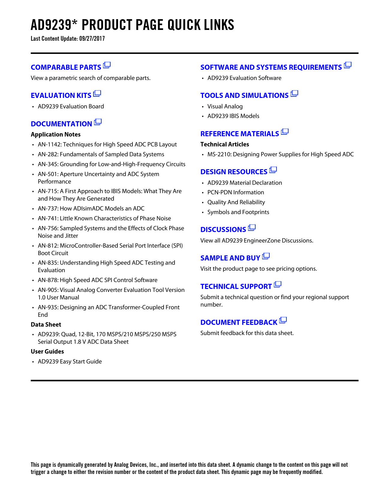 AD9239* PRODUCT PAGE QUICK LINKS Last Content Update: 09/27/2017. COMPARABLE PARTS. SOFTWARE AND SYSTEMS REQUIREMENTS