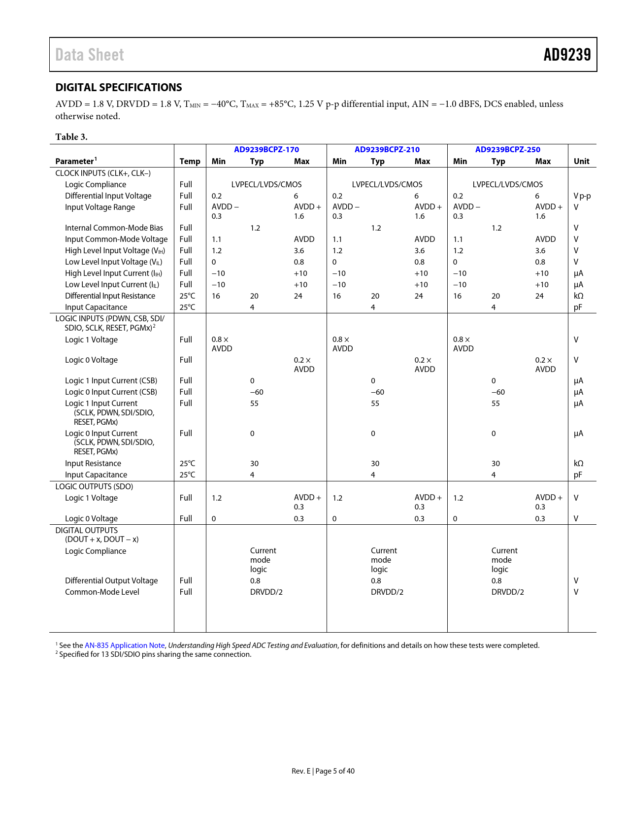 | Pages / Page | 41 / 6 — Data Sheet. AD9239. DIGITAL SPECIFICATIONS. Table 3. AD9239BCPZ-170. … |