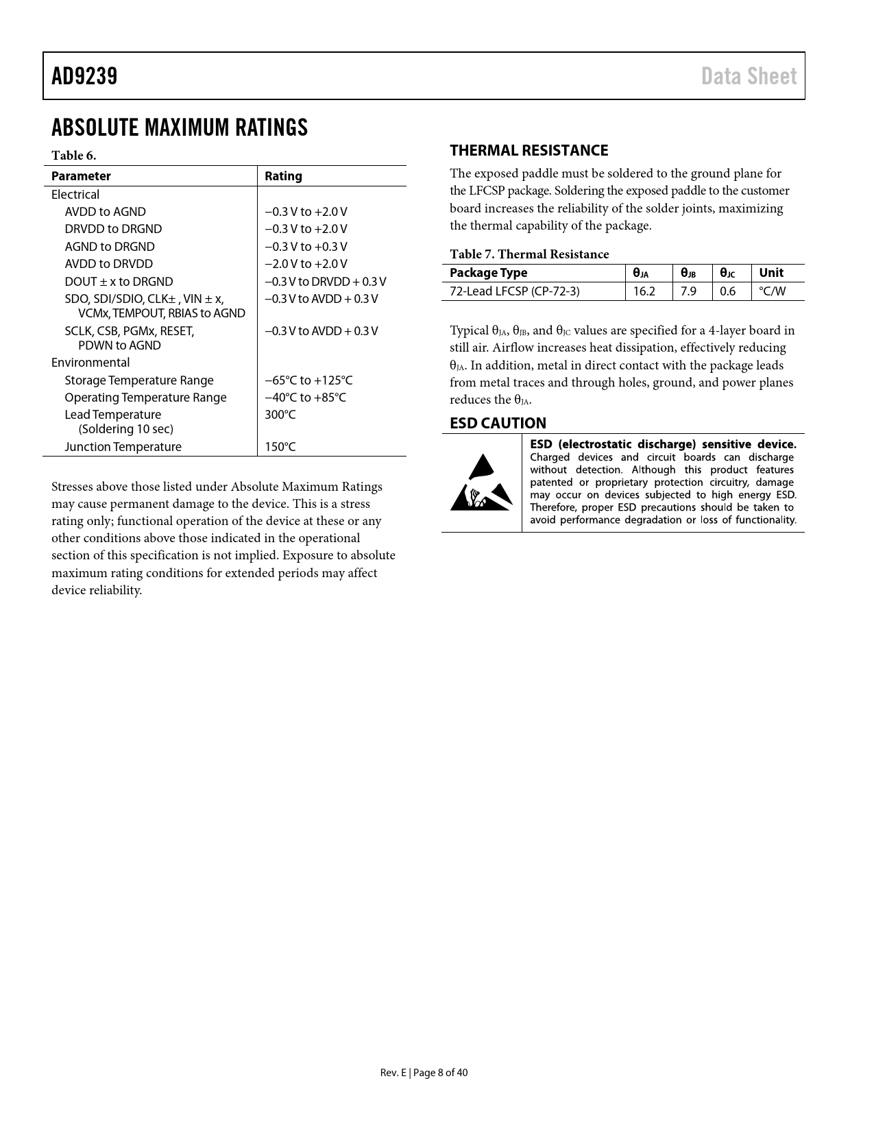 Pages / Page41 / 9 — AD9239. Data Sheet. ABSOLUTE MAXIMUM RATINGS Table 6. THERMAL RESISTANCE. …