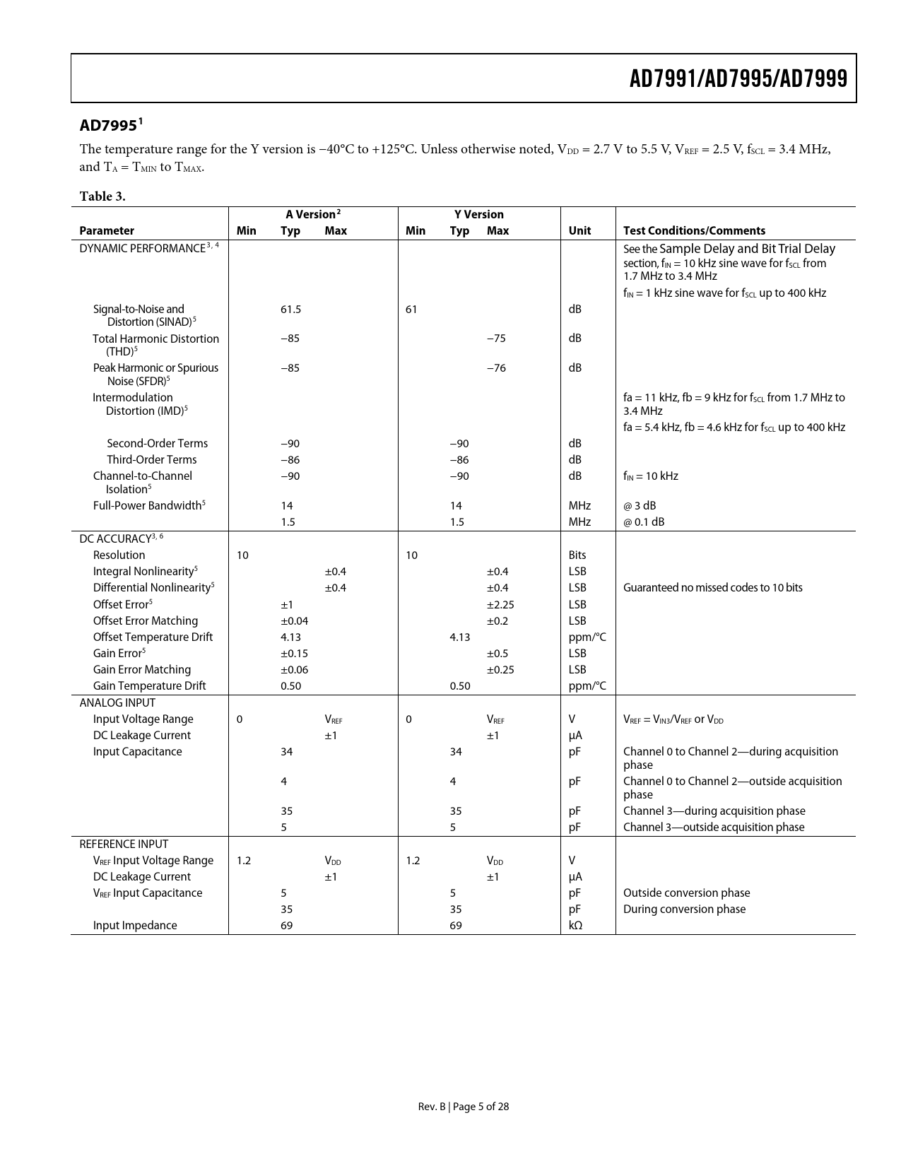 Pages / Page28 / 5 — AD7991/AD7995/AD7999. AD79951. Table 3. A. Version2. Version. Parameter. …